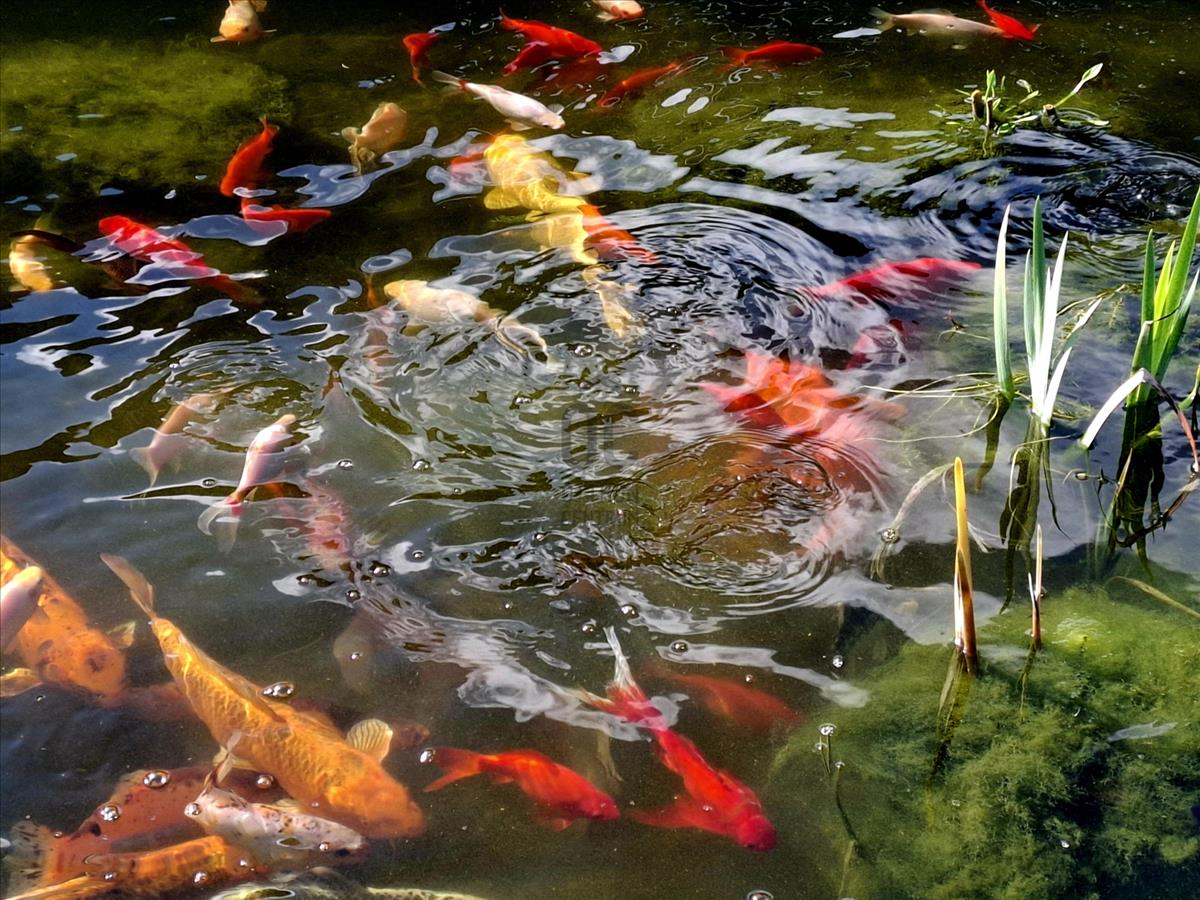 csodálatos koji pontyokkal és kárászokkal telepített kerti tó,