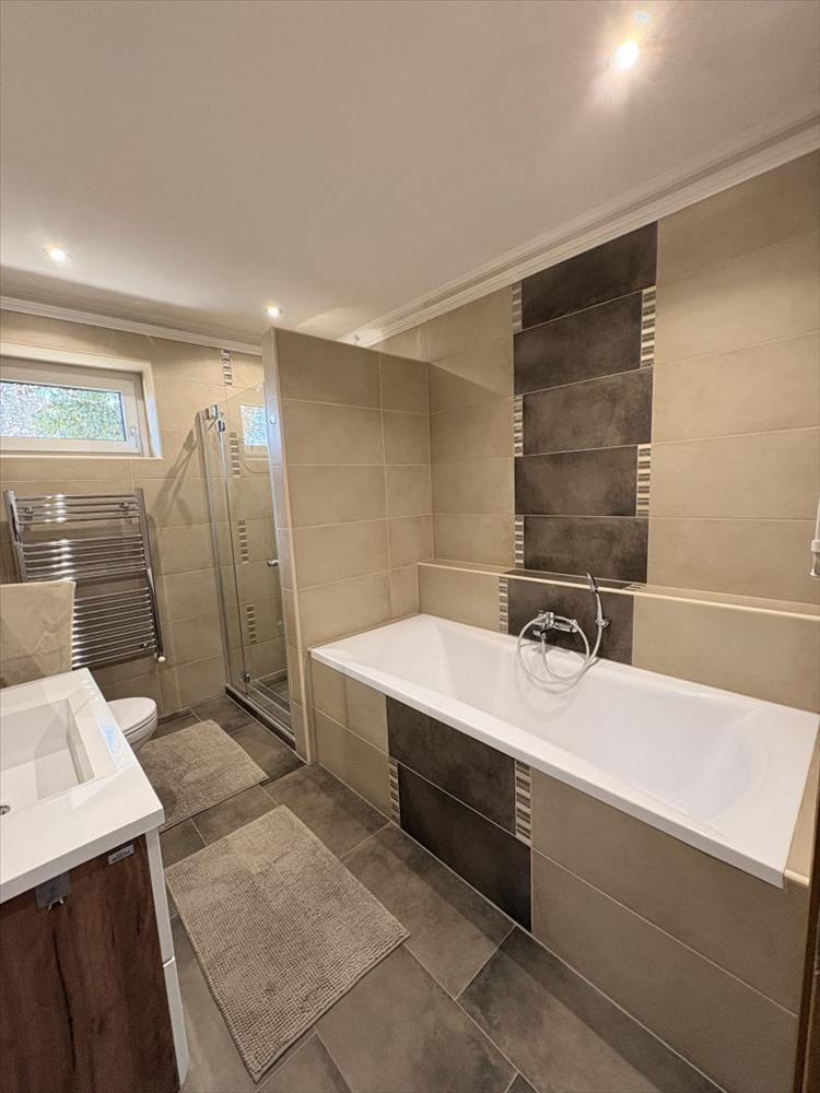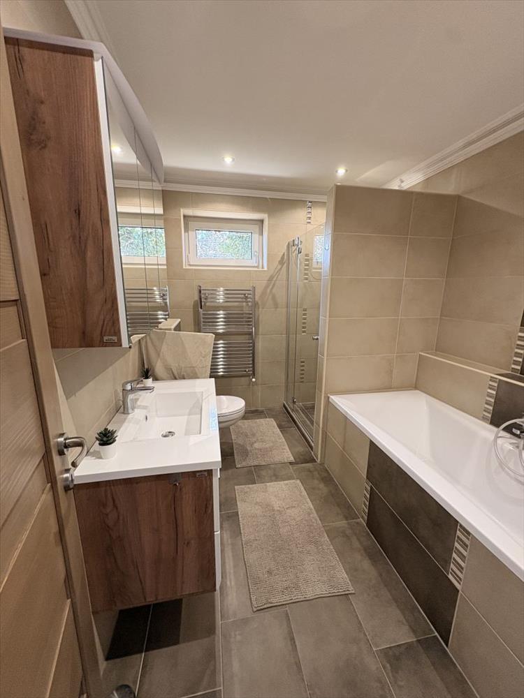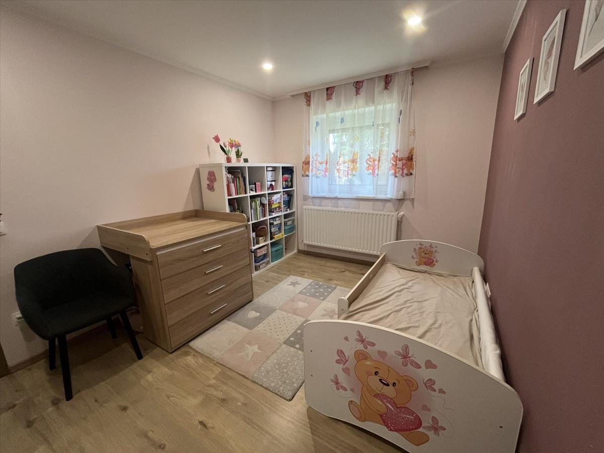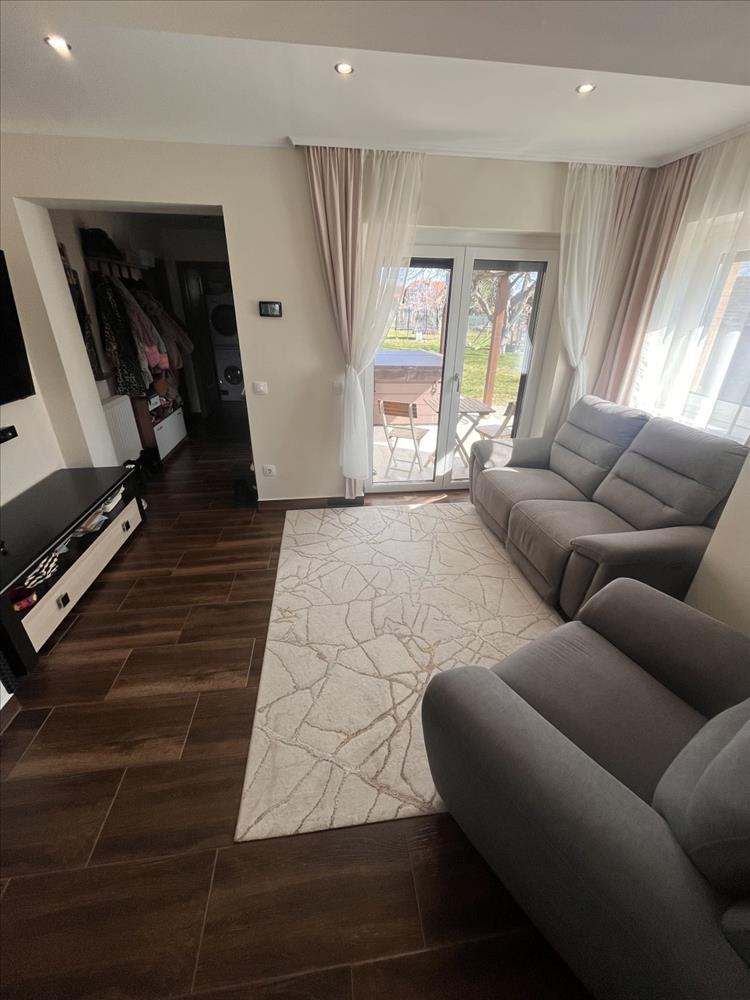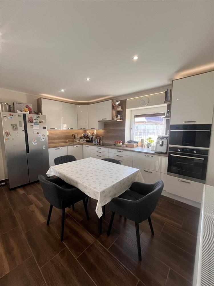 A belső tér praktikus és élhető: egy világos, egybenyitott nappali–konyha–étkező képezi az otthon központját, ahonnan közvetlen kijárat nyílik a 12 m²-es fedett teraszra. Emellett három külön nyíló szoba, egy igényes fürdőszoba káddal és épített zuhannyal, külön wc, valamint egy több funkcióra is alkalmas gépészeti helyiség (akár dolgozószoba vagy mosókonyha) áll rendelkezésre.
