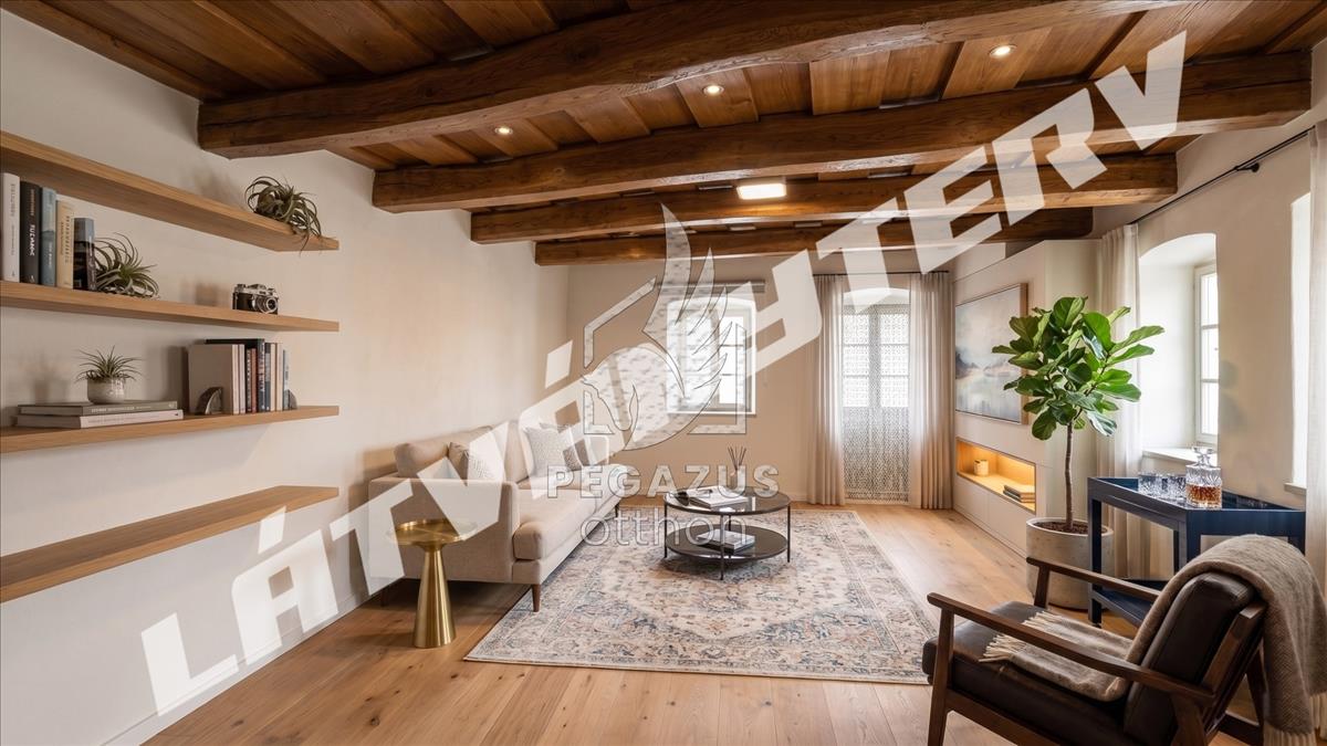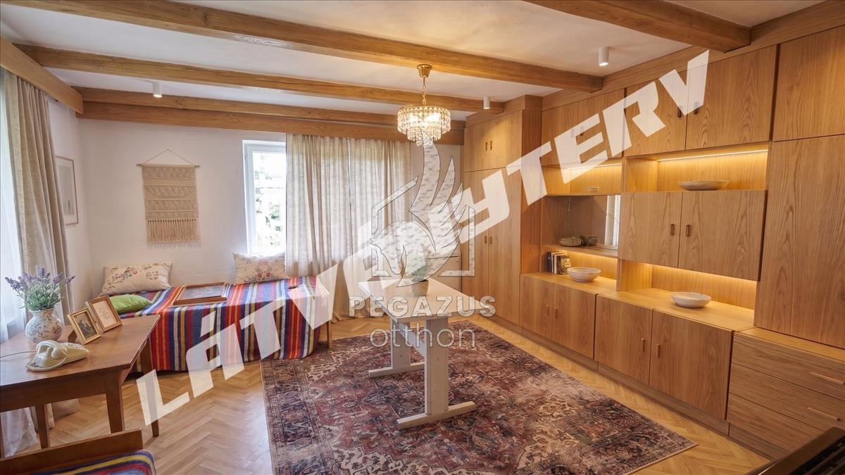 A ház egyik legkülönlegesebb látványeleme a jelenlegi mennyezet felett rejtőzik: a felső rétegek eltávolításával előtűnik az eredeti, korhű fagerendás szerkezet, amely azonnal vidéki hangulatot kölcsönöz az otthonnak.