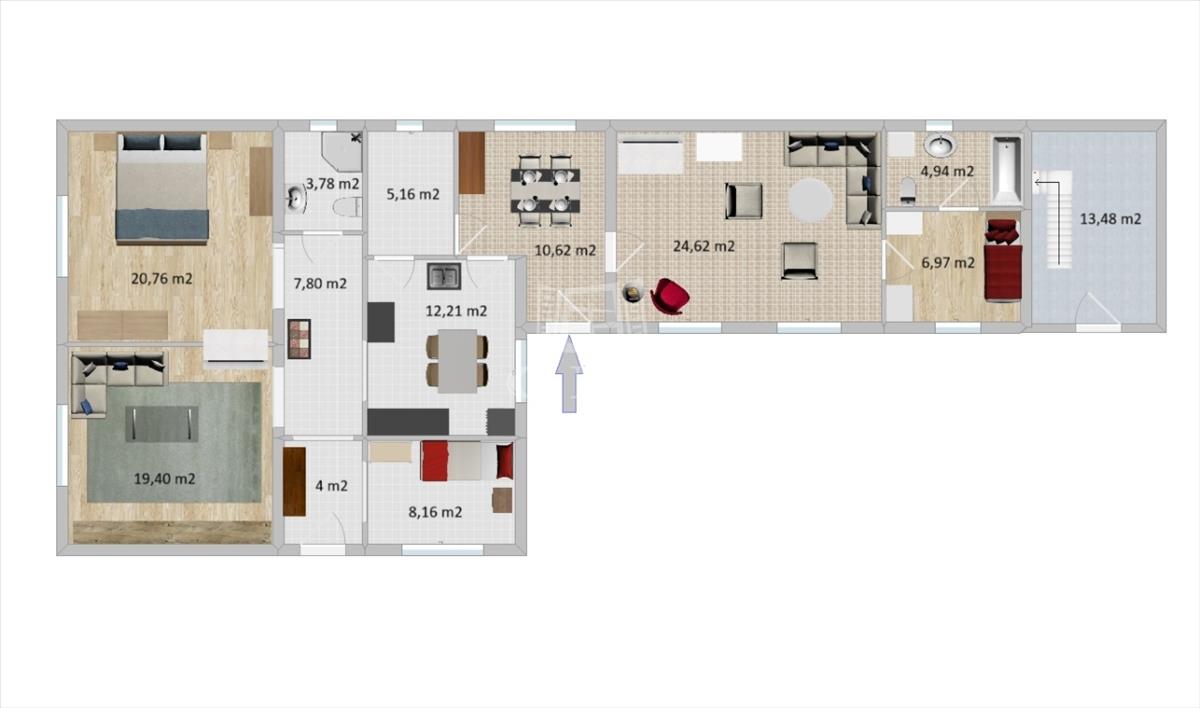 Az utcafronti rész az 1960-as években épült beton alapra, fa födémmel, egyedi gyártású, eredeti, és még mindig szép állapotú ablakokkal és beltéri ajtókkal. a szobákban parketta, a közös helyiségekben járólap található.