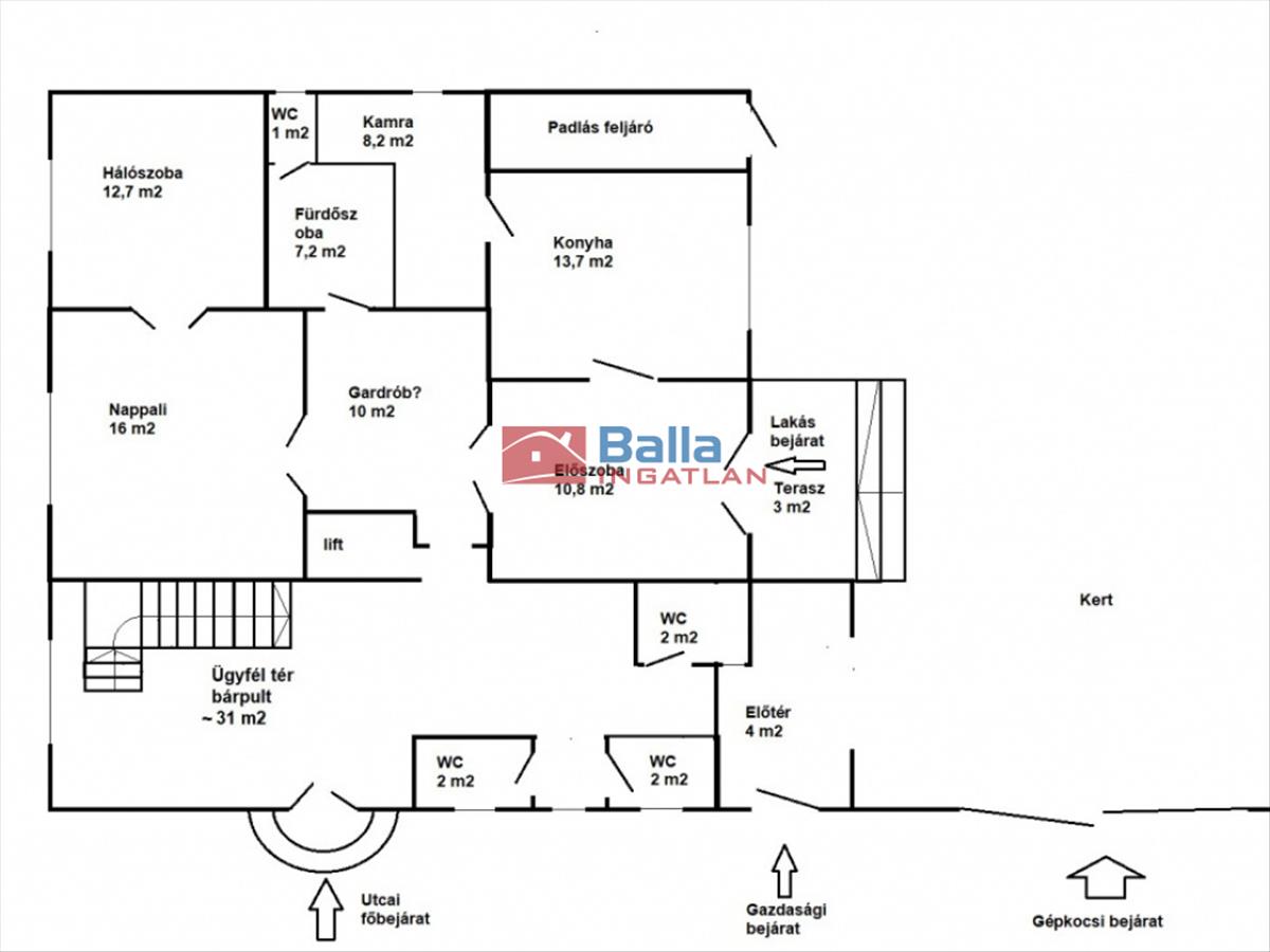 Az utcáról nyíló főbejárattal rendelkező vendéglátó rész összesen 84 m2-es, ebből 38 m2 a földszinten, bárpulttal, vendégmosdókkal, és a manzárdban egy 38 m2-es vendégtérrel és 8, 5 m2-es vendégmosdóval rendelkezik.