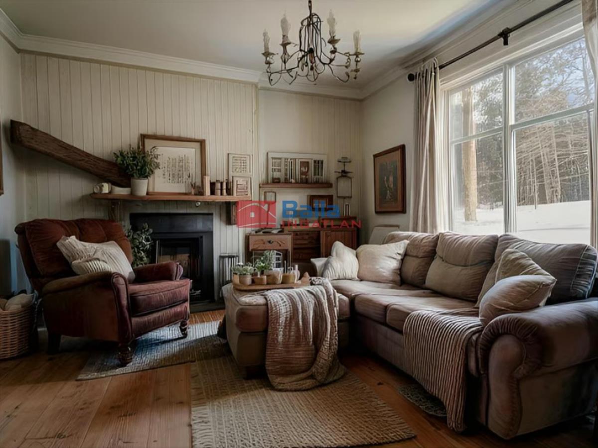 A nappaliban kandalló is képes befűteni a lakórészt, de alapvetően egy gázkazán biztosítja a fűtést radiátorokon keresztül, és a meleg vizet is.