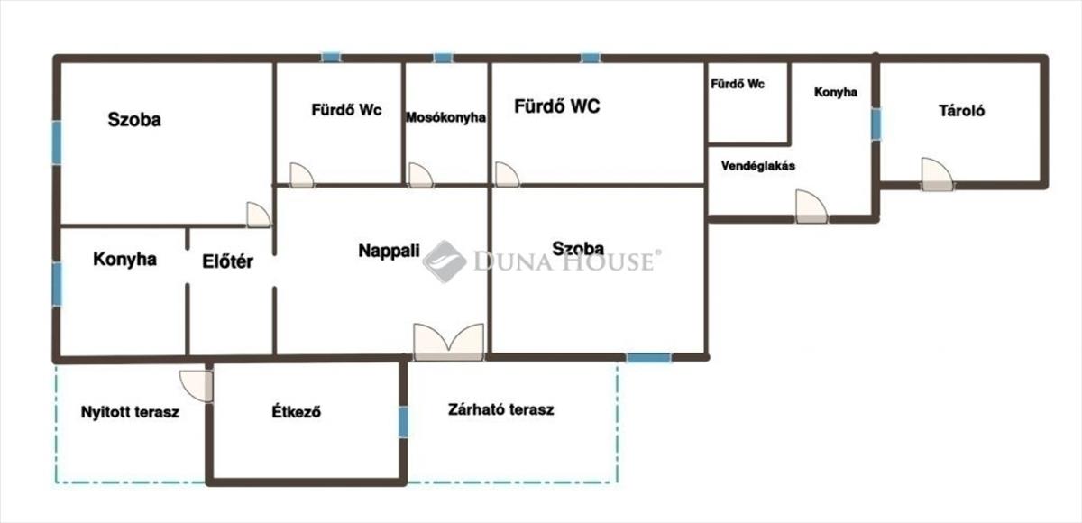 Belépés után az előszobába és az étkezőben találjuk magunkat, balra a konyha helyezkedik el és a hálószoba. Tovább haladva a nappaliba érkezünk Ahonnan az egyik fürdőszoba nyílik és a mosókonyha. a nappalin keresztül juthatunk el a második hálószobába és a második fürdőszobába is. a nappaliból nyílik még a fedett terasz is.