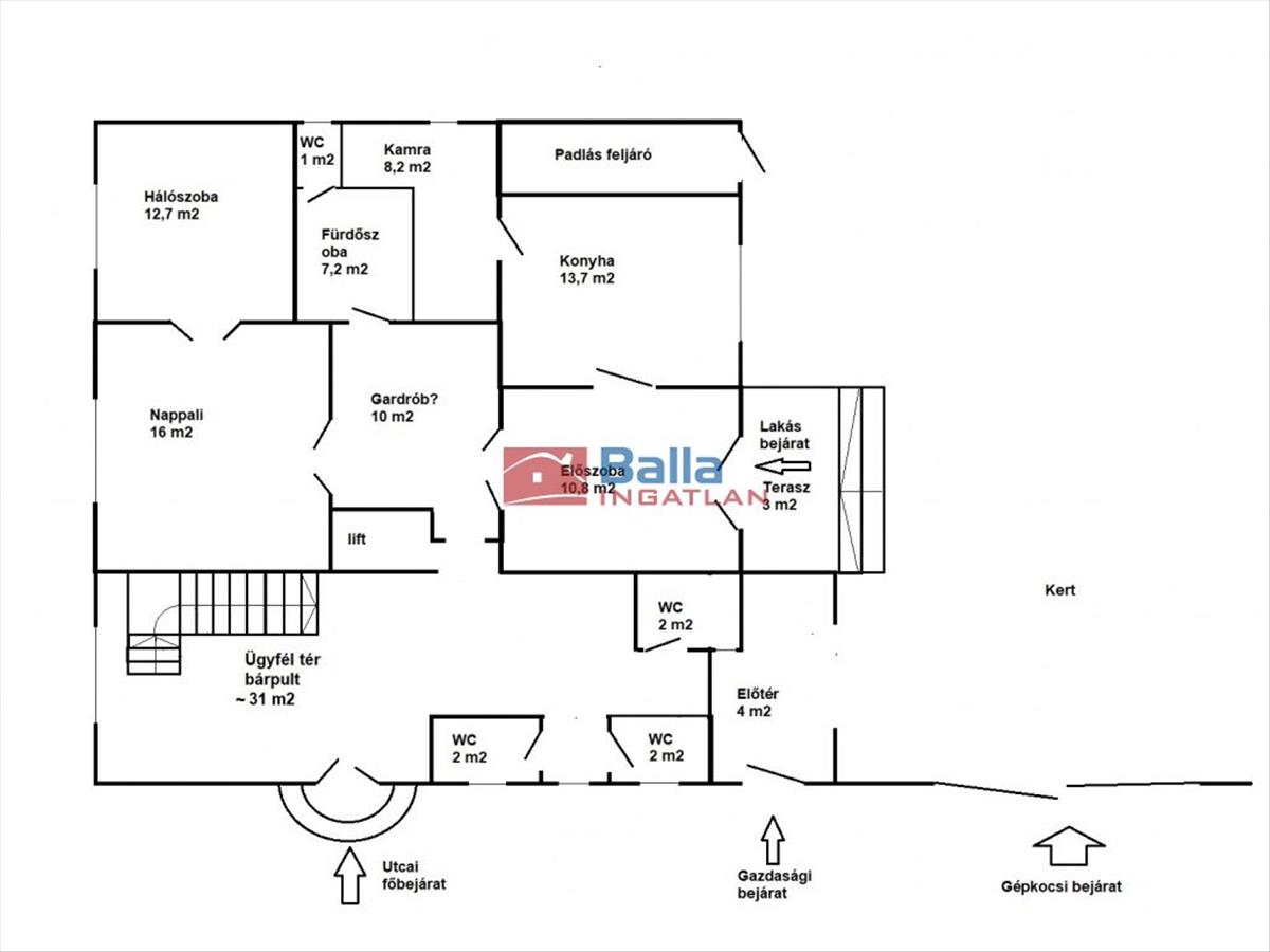 Az utcáról nyíló főbejárattal rendelkező vendéglátó rész összesen 84 m2-es, ebből 38 m2 a földszinten, bárpulttal, vendégmosdókkal, és a manzárdban egy 38 m2-es vendégtérrel és 8, 5 m2-es vendégmosdóval rendelkezik.