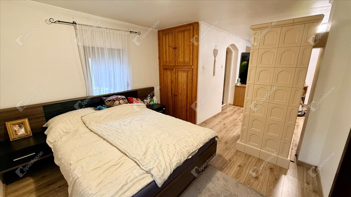 Alsó szint: tágas konyha-étkező, két szoba, közlekedő, fürdőszoba káddal és zuhannyal, külön WC.
