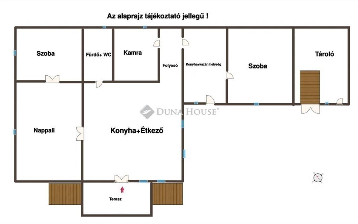 Az ingatlan lakott, felújított és fűtött része kb. 100 M², ahol kényelmes elrendezésben található egy hálószoba, nappali, konyha-étkező, fürdőszoba WC-vel, valamint egy kamra, amely mosókonyhaként is funkcionál.