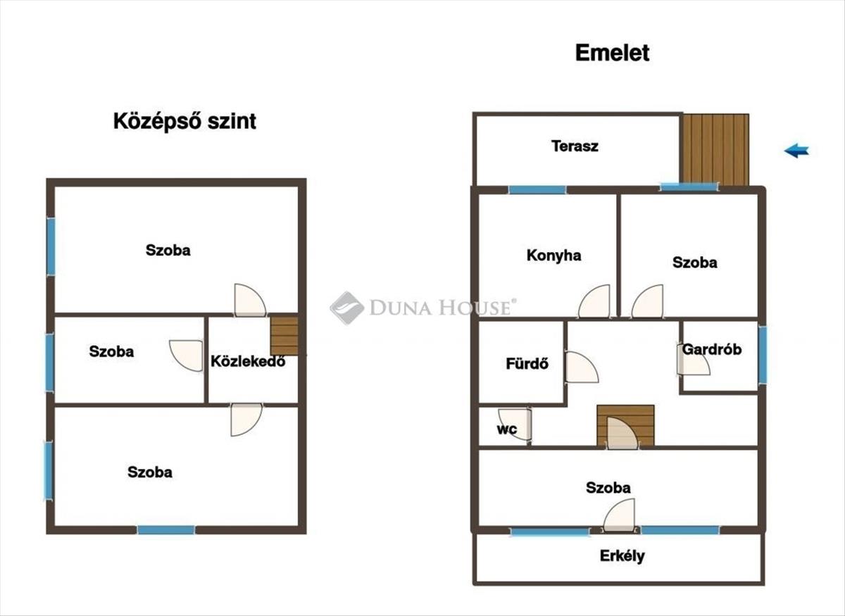 emelet külön bejárattal: konyha, szoba, gardrób, tágas 30 m2 szoba, erkély utcafronton, terasz az udvarra, fürdő, külön wc