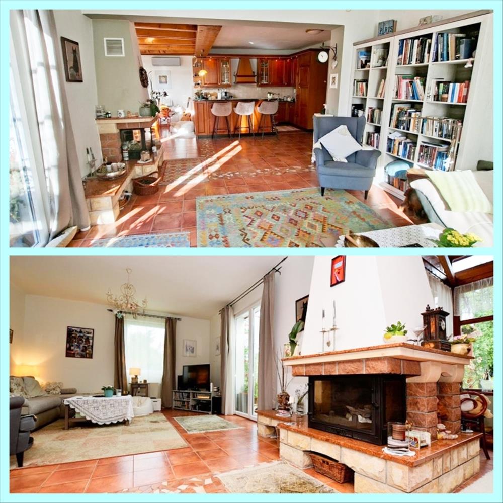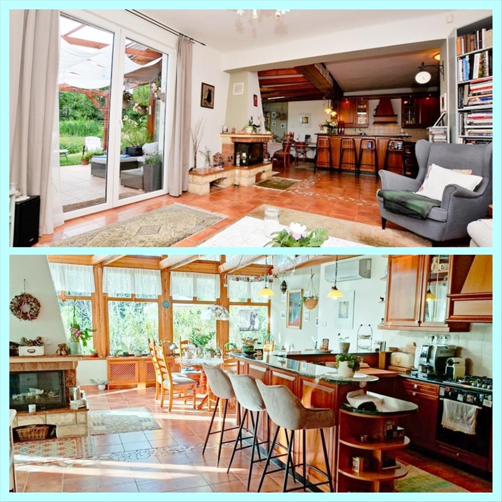 A közel 60 nm -es, kertkapcsolatos nappali-étkező-konyha egy légterű, harmónia és meleg színek jellemzik, a barátságos otthon hangulatát tovább fokozza a szép kivitelezésű, működő kandalló. Ugyanitt H-tarifás hűtő-fűtő klíma van 2024 óta. a konyha Electrolux gépekkel: beépített hűtő, mosogatógép, gáz főzőlap, elektromos sütő. a földszinten található még 1 hálószoba, fürdőszoba, külön wc, gardrób/kamra szoba és tükrös beépített gardrób szekrények.