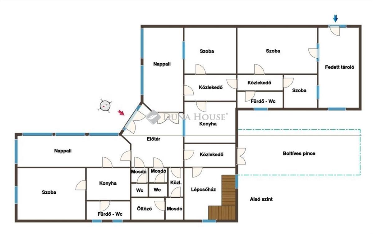 Az alsó szint jelenleg felújítandó állapotban van, itt akár további apartmanok, lakótér kialakíthatóak, de vállalkozási, akár ügyfélfogadási, vagy más üzleti célra is remekül hasznosítható. a két szint külön külső bejáraton át is elérhető, de belső lépcső is összeköti őket.