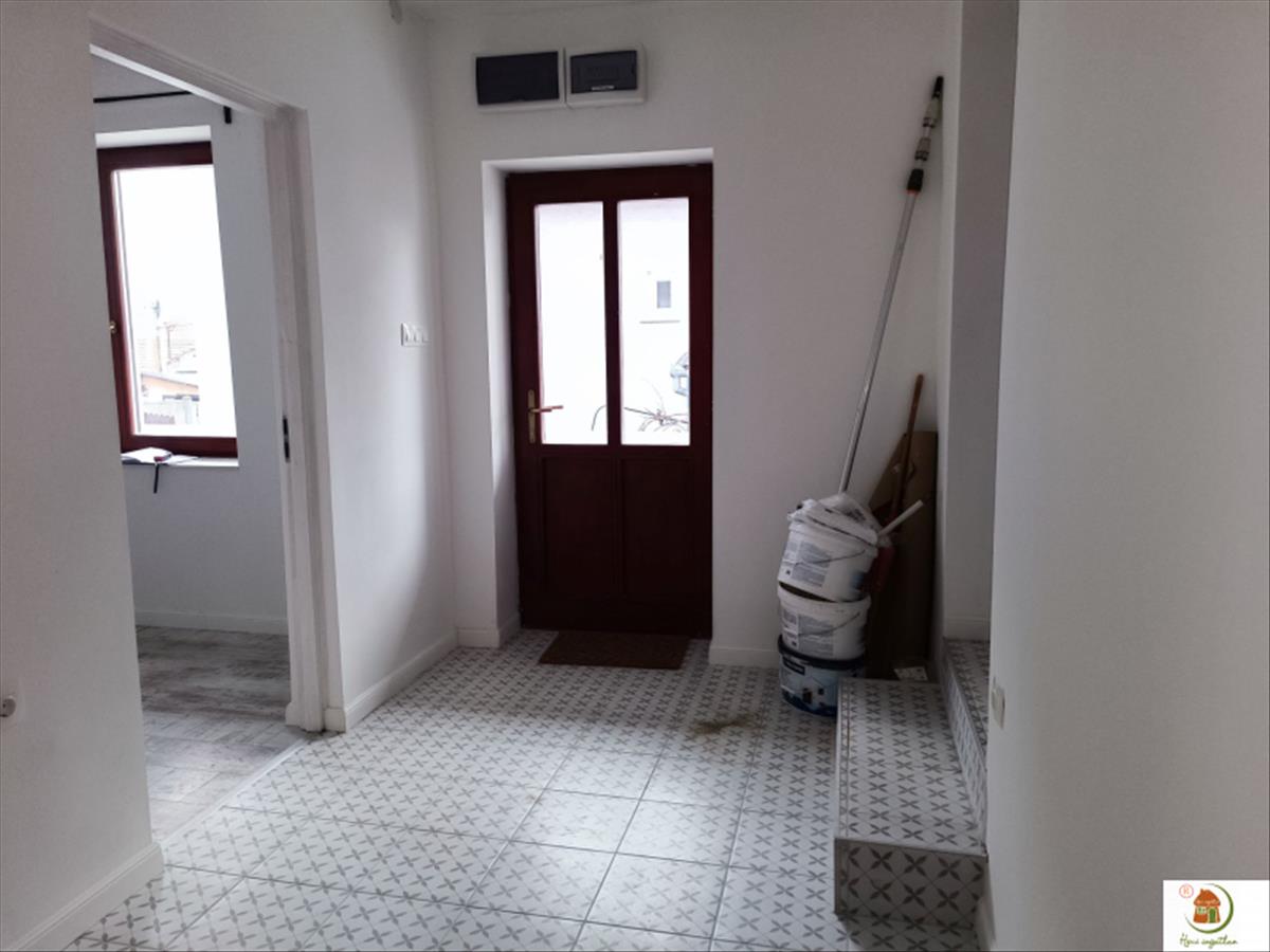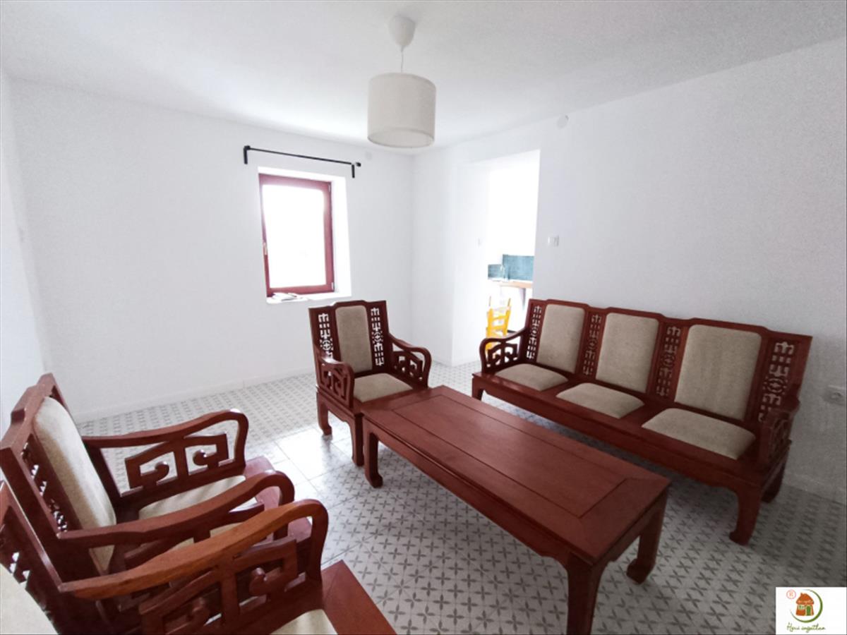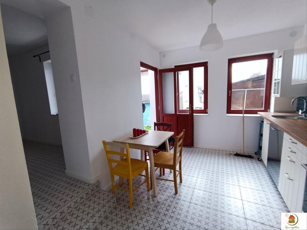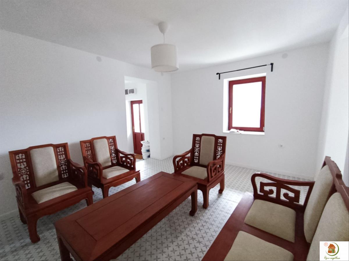 Zwei Eingänge, Flur, Küche mit Essbereich, Badezimmer mit Dusche und wc, Wohnzimmer, zwei Zimmer, Veranda, Keller. Der Flur kann bei Bedarf in ein weiteres Zimmer umgewandelt werden.