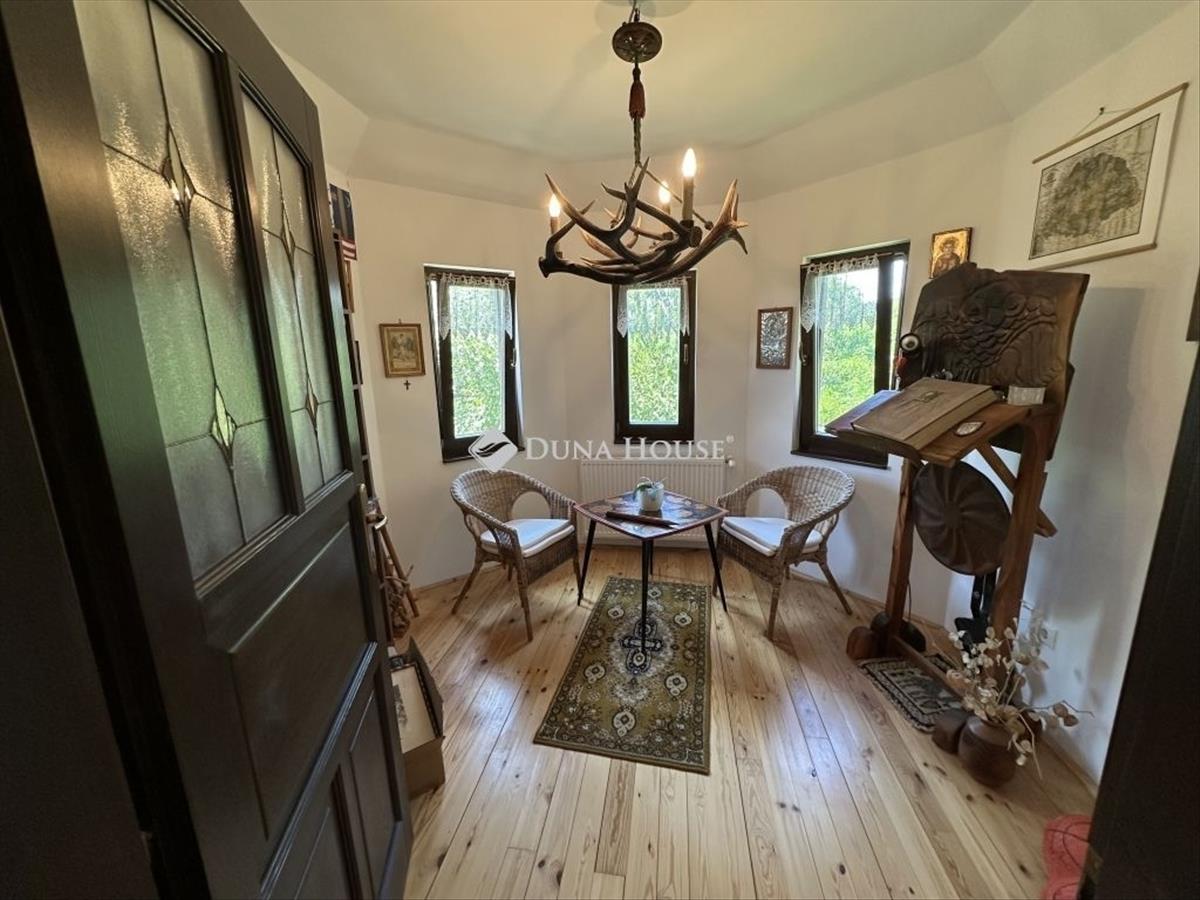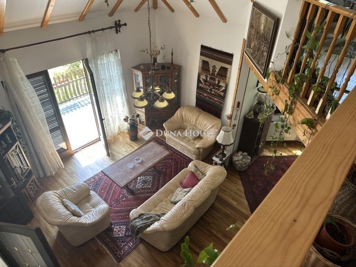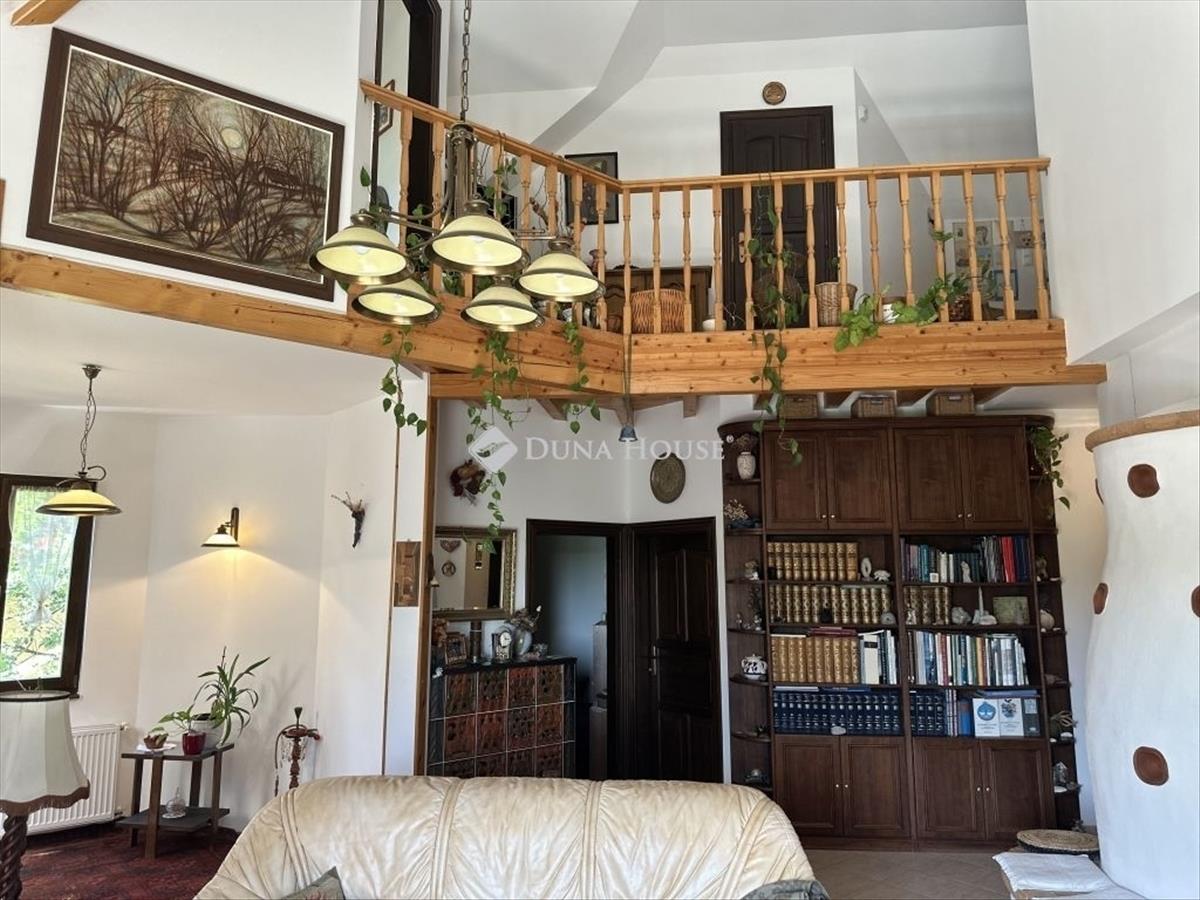 - Az előtérből jobbra fa lépcső vezet fel a tetőtérbe, ahonnan lelátunk a látványos nappaliba