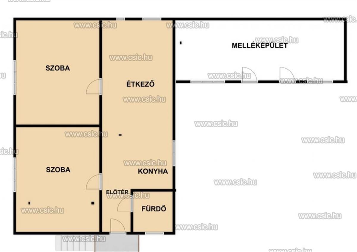 Beosztását tekintve tágas előszoba, világos konyha, hatalmas étkező. 2 Nagyméretű szoba, zuhanyzós fürdőszoba szolgálja az ott lakók kényelmét. a 38 m2-es világos melléképület két bejárattal rendelkezik, igény szerint külön lakótérré alakítható.