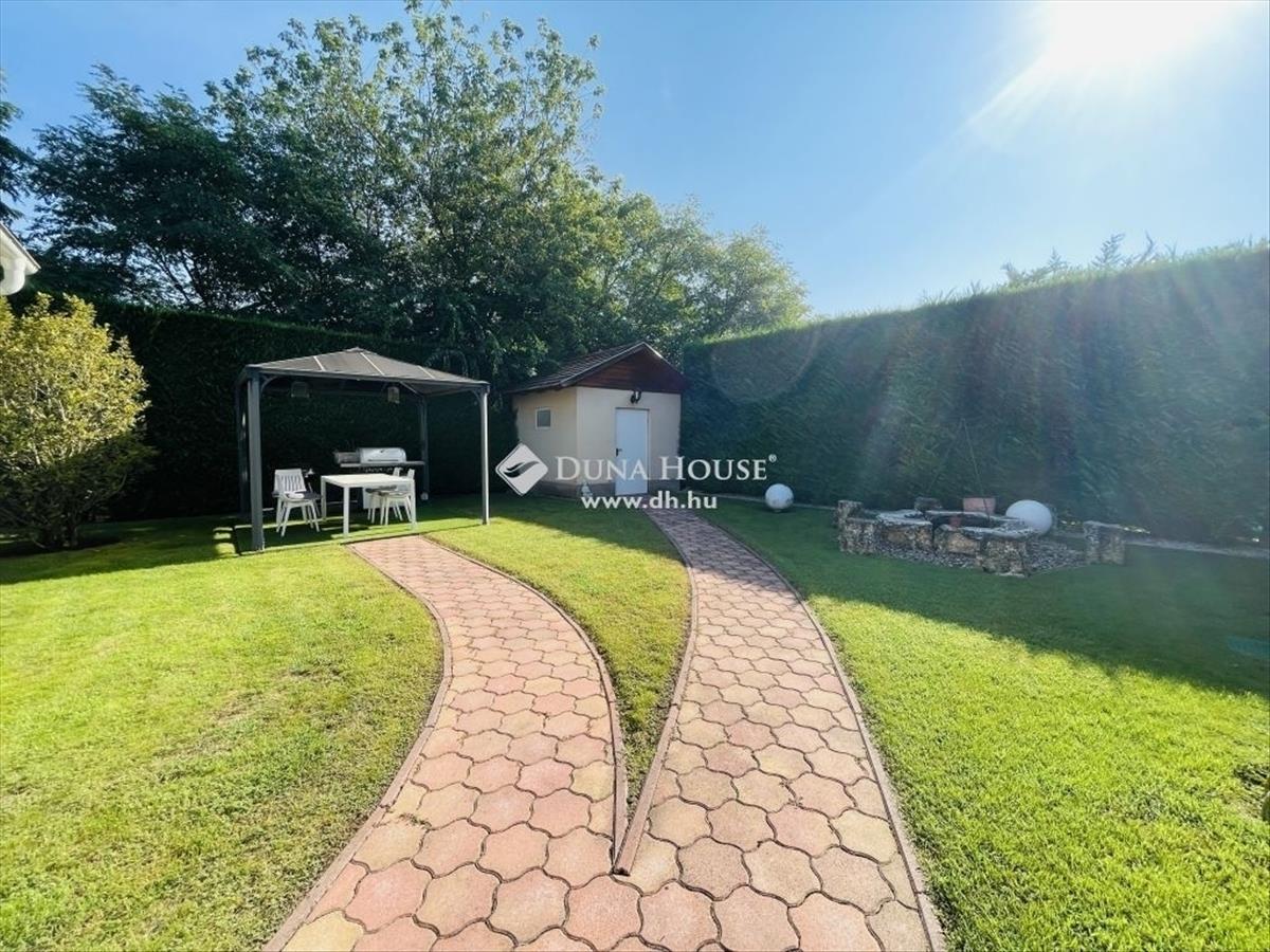 Az ingatlan egy hatalmas telek végében található, amelyet egy térkővel kirakott úton tudunk megközelíteni, körülötte kertész által gondozott fű, parkosított, dísznövényekkel telepített kert.
