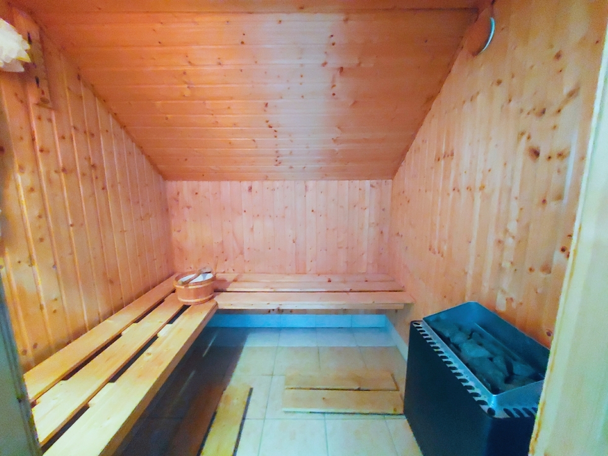 A klimatizált ház földszintjén kapott helyet az amerikai konyhás nappali, továbbá egy zuhanyzós fürdő. Az emeleten újabb nappali található biliárd asztallal, valamint két háló és egy kádas fürdő. a tetőtérben kapott helyet a wellness részleg, itt egy nagy szobában kondigép, szolárium, valamint szauna és zuhanyzó található.