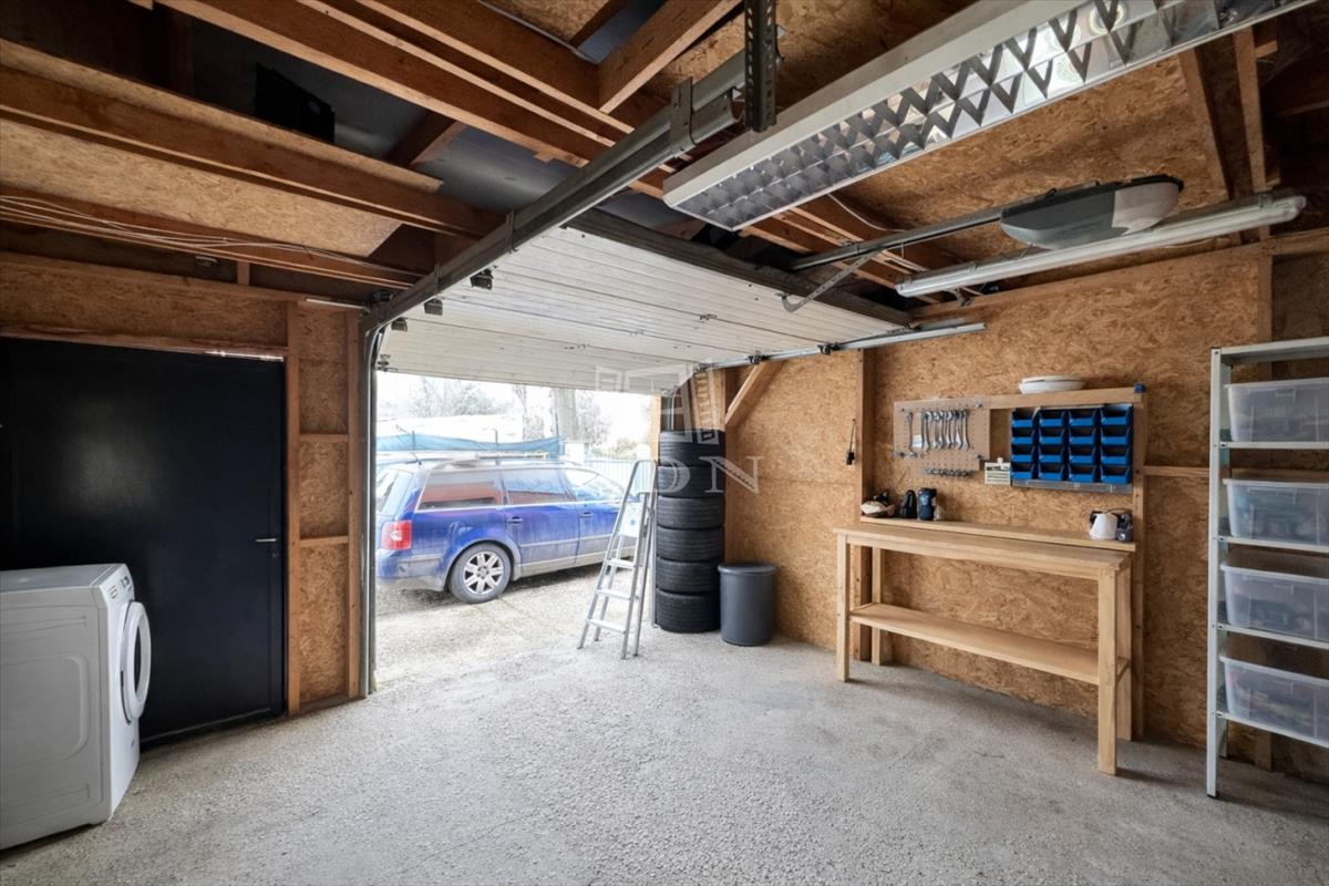Elöl az udvarban garázs (műhelynek is alkalmas), és tároló is található.