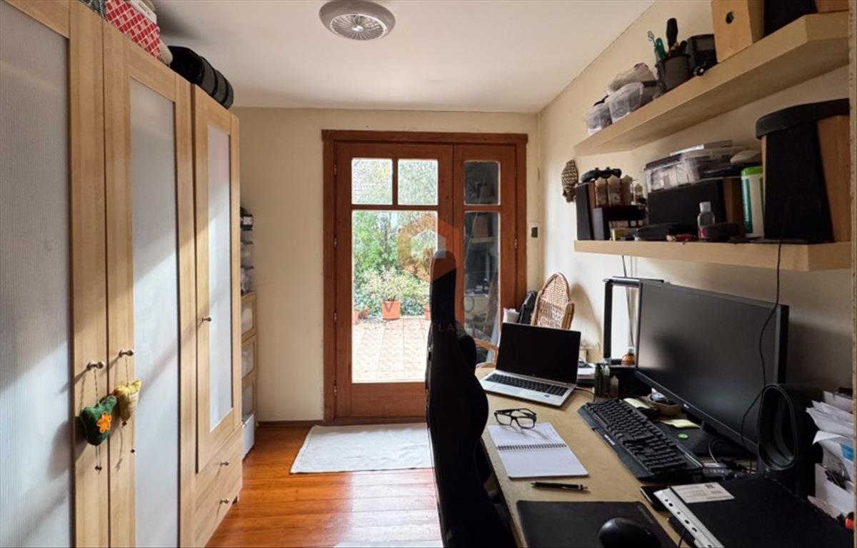 A két szoba között egy dolgozónak és gardróbnak is használt helyiségen keresztül jutunk ki a nagy védett teraszra.