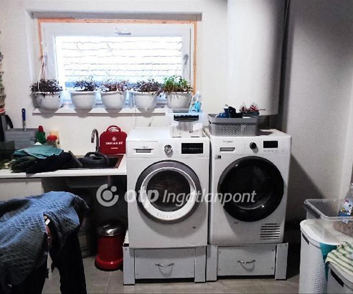 Majd egy háztartási helyiség, ahol német minőségű mosó- és szárítógép található, valamint egy tároló van.
