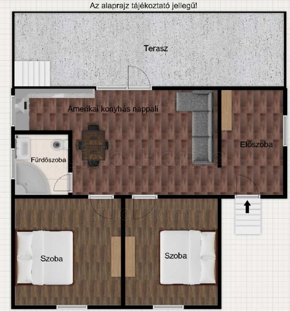 Elrendezése: Előszobán keresztül az Amerikai konyhás nappaliba érkezünk. Innen nyílik a 2 hálószoba, fürdőszoba, 24 m2 terasz. Az udvaron hátul garázs és egy nyári konyha található.