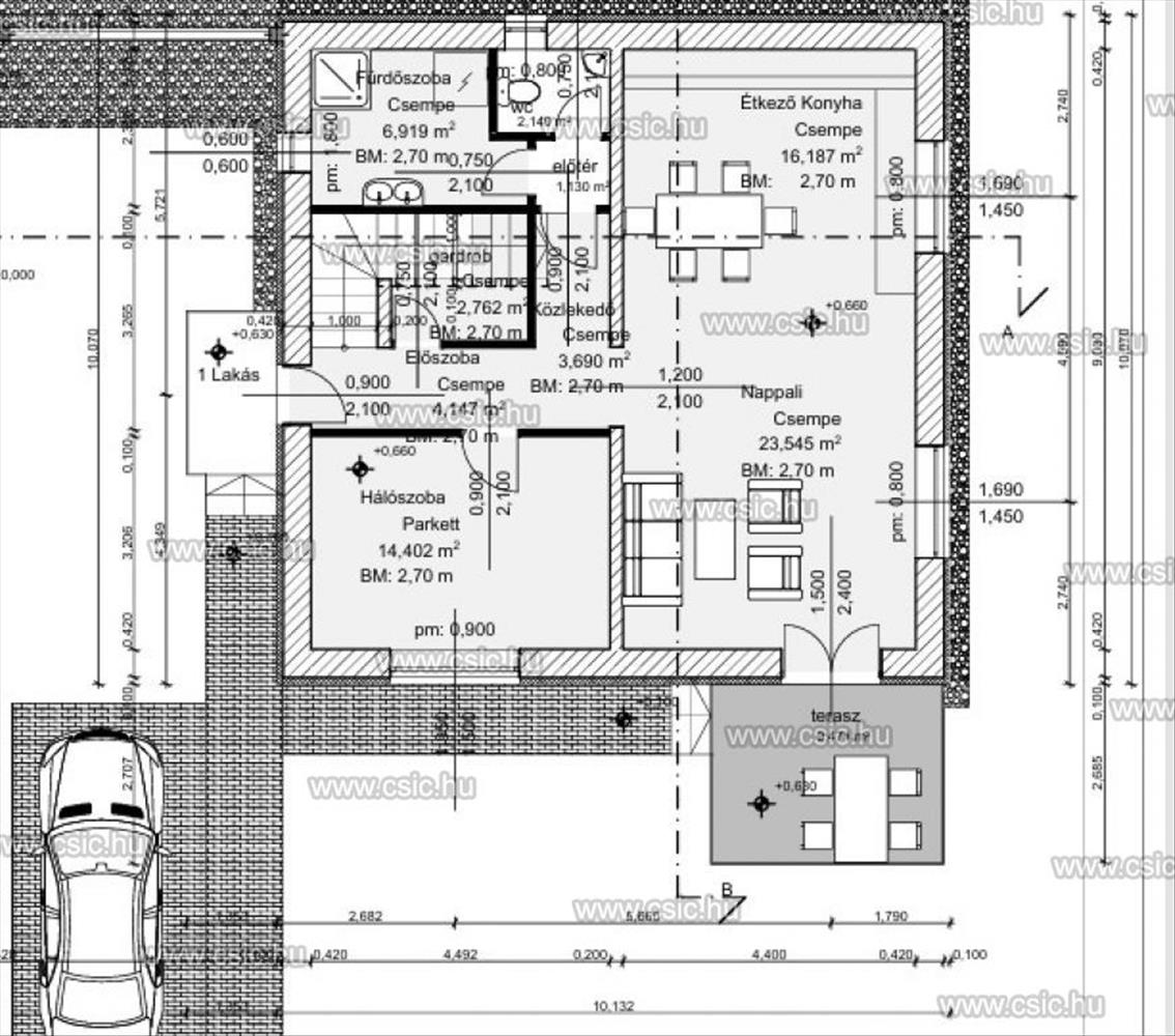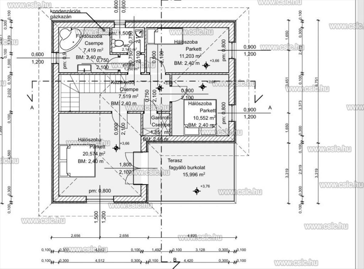 A kétszintes családi házban a földszinten nappali-étkező, konyha, terasz- kertkapcsolat, szoba fürdőszoba, mosdó, előszoba, gardrob, az emeleten 3 szoba (16 nm-es terasz kapcsolattal, fürdőszoba, mosdó, közlekedő került kialakításra.