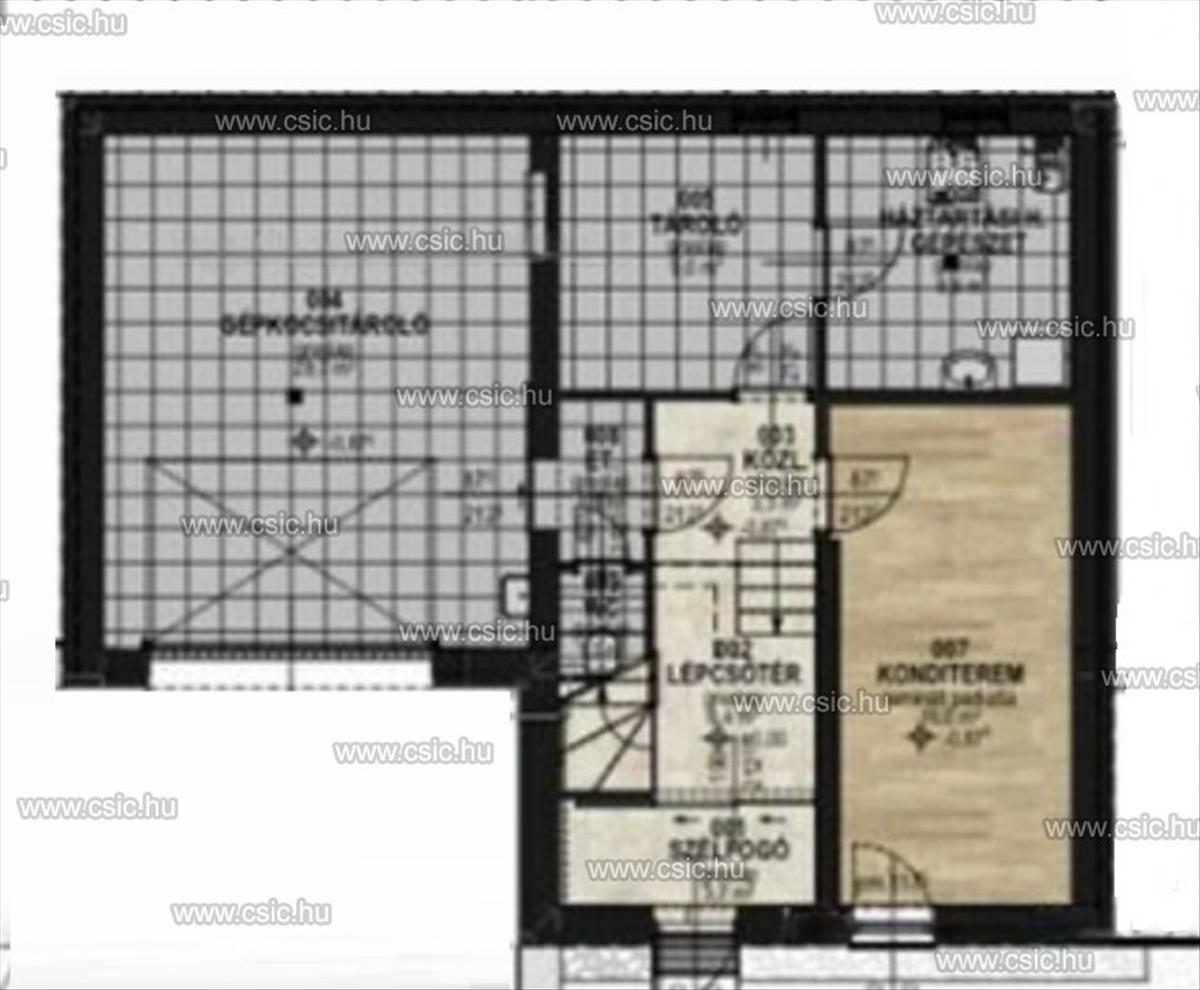 •Elosztása az utcaszinten nagyméretű garázs, tároló, gépészeti helyiség, mosókonyha, wc, és egy dolgozónak vagy edzőszobának is használható helyiség