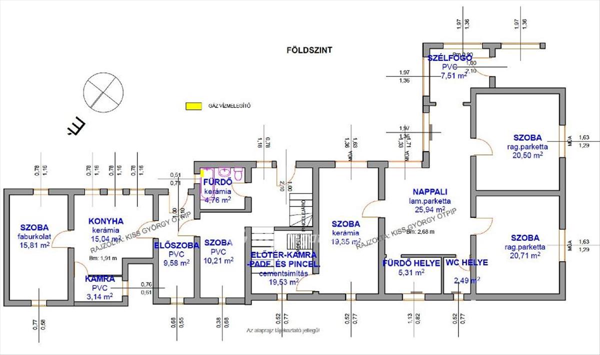 Helyiségek: Földszint: 4 szoba, félszoba, kamra, konyha, előszoba, fürdőszoba, előtér, nappali, még egy fürdő és külön wc helye (főépületrészben), összesen: 179, 88 m2. Pince: 4 helyiség, összesen: 38 m2.