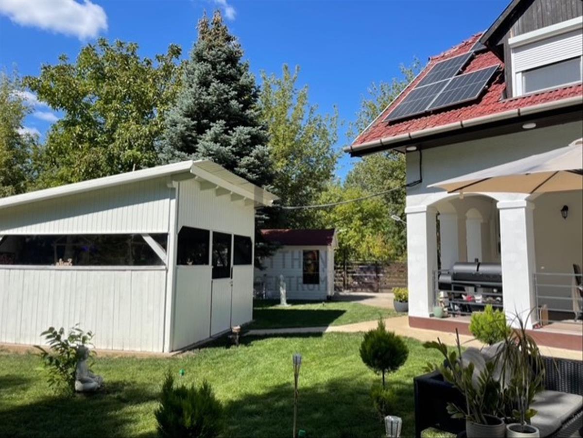 A kertben kialakított 15 m²-es medence a nyári pihenés központja, míg a 10 kW-os napelemrendszer hosszú távon gazdaságos fenntartást biztosít.