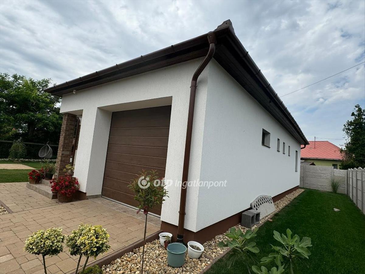 Helyiségek: nappali-konyha-étkező (amerikai konyhás nappali), 2 szoba, szélfogó, előtér, fürdő, wc, kamra, fedett terasz, garázs.