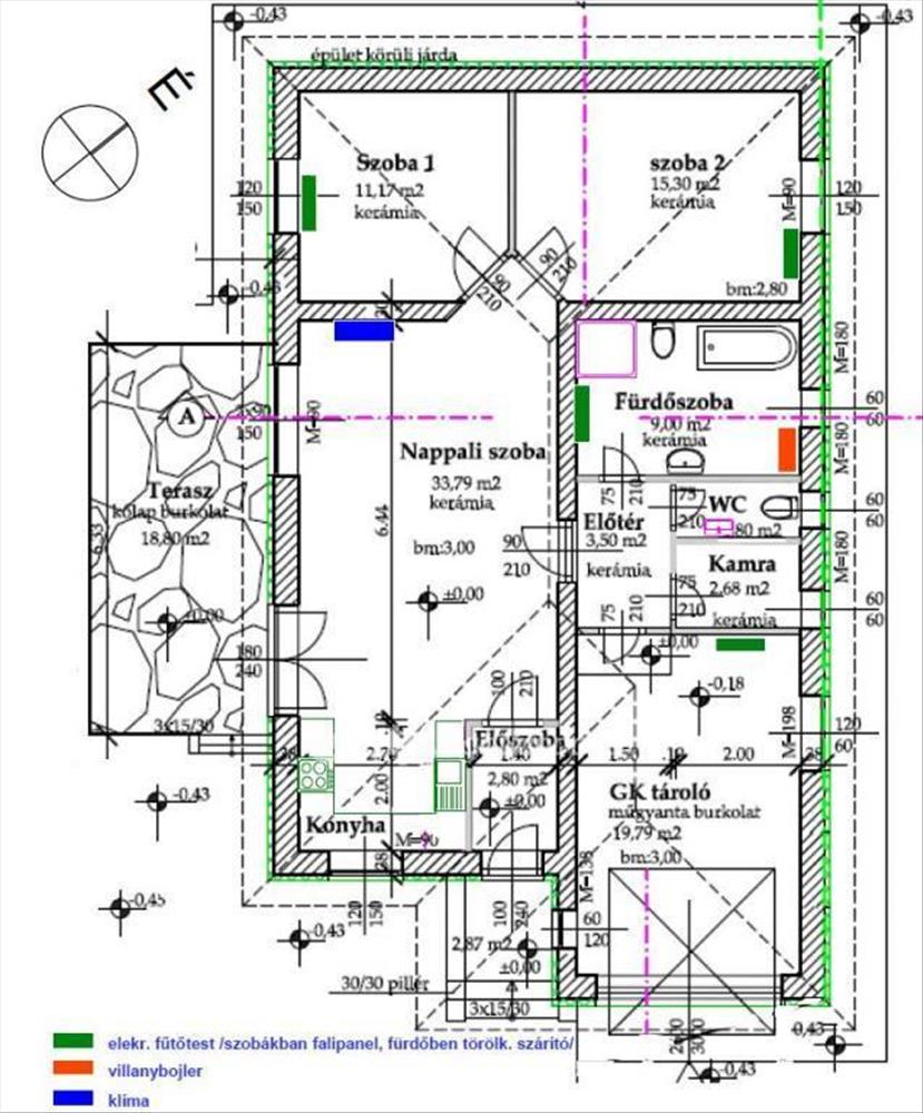 Fűtés: hirdegburkolatos helyiségekben heatcom elektromos padlófűtés, szobákban és a garázsban elektromos falipanel, nappaliban hűtő-fűtő klíma is.