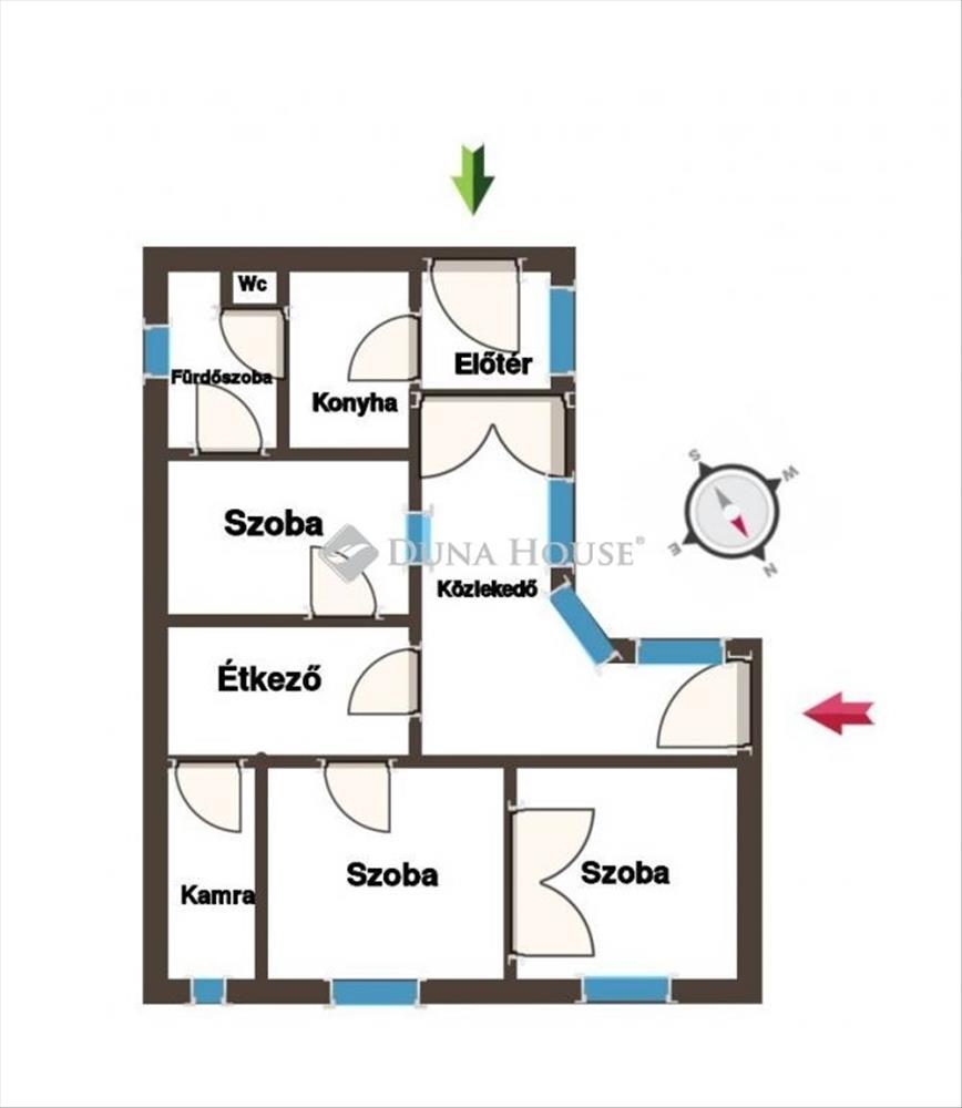 - 3 külön nyíló szobával, konyha, étkező, fürdő, wc, kamra helyiségekkel rendelkezik