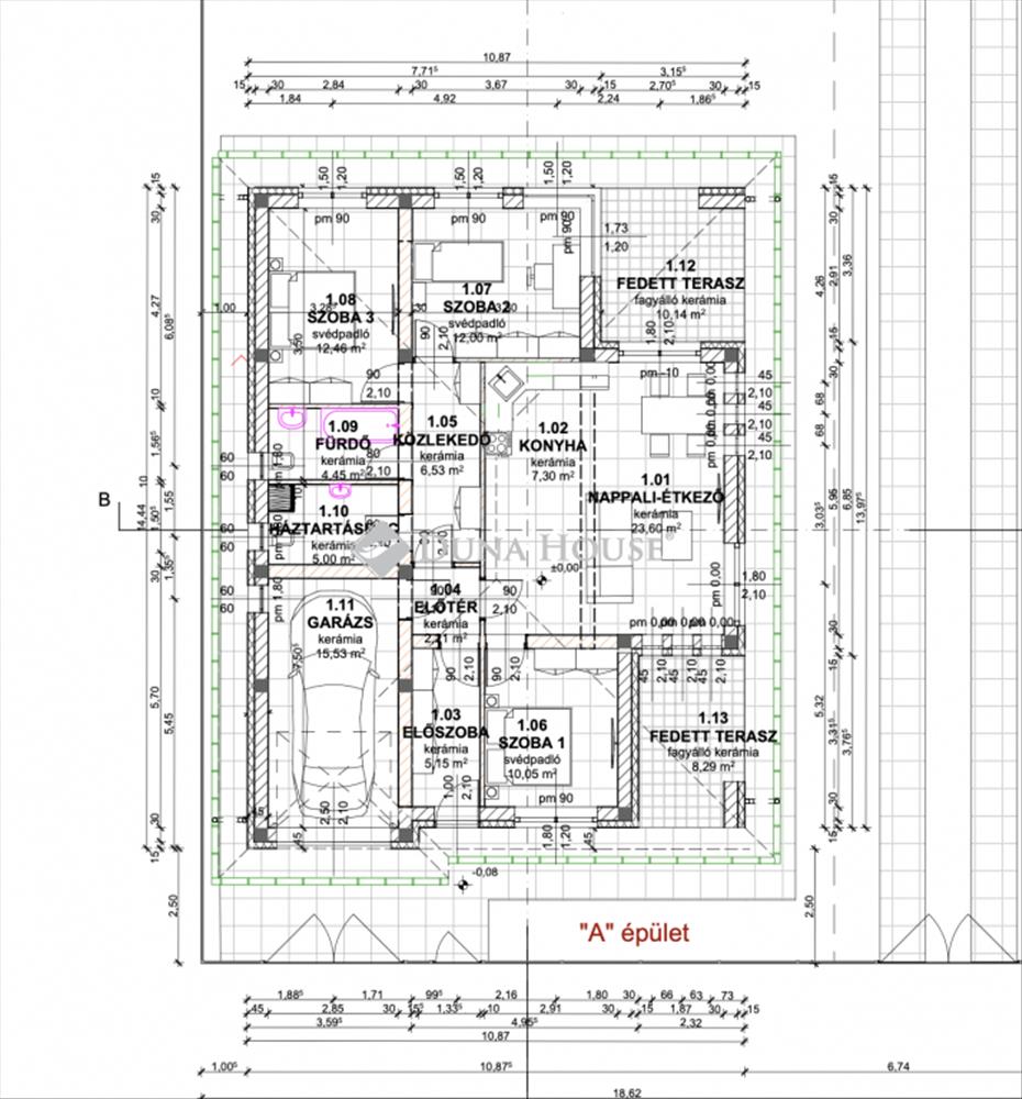 Az ingatlan nettó hasznos területe 88, 75 m2 + 15, 53 m2 garázs, 2 db fedett terasz, 547 m2 kertkapcsolattal. a helyiségek napfényesek, köszönhetően a jó tájolásnak és a jó méretű egyedi nyílászáróknak.