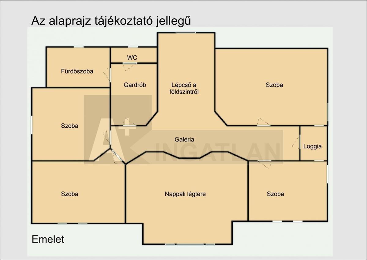 A földszintről felvezető lépcsőn keresztül az emeleti galériára érkezünk, ahonnan teljes egészében belátható a földszinti nappali. a galériáról nyílik 4 külön bejáratú hálószoba és egy fürdőszoba.