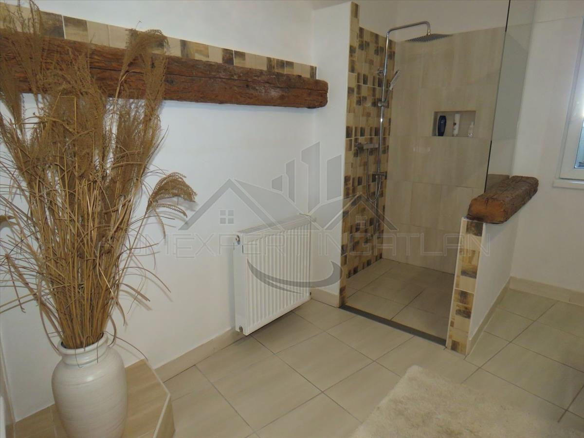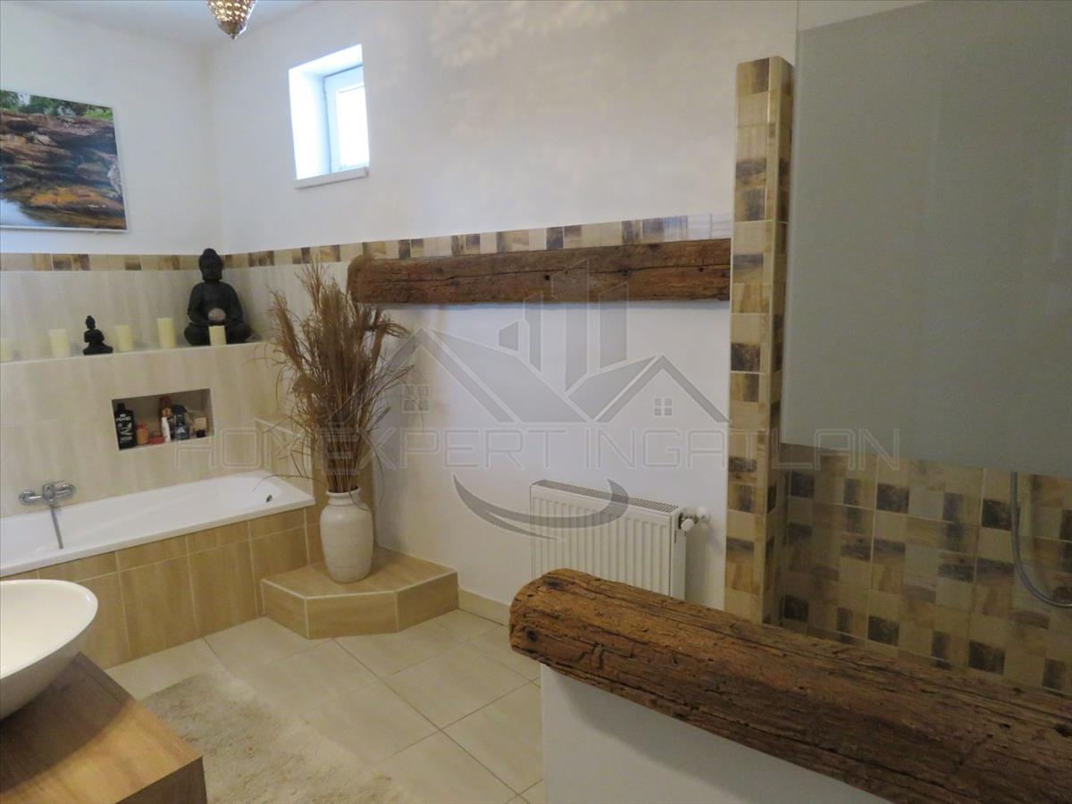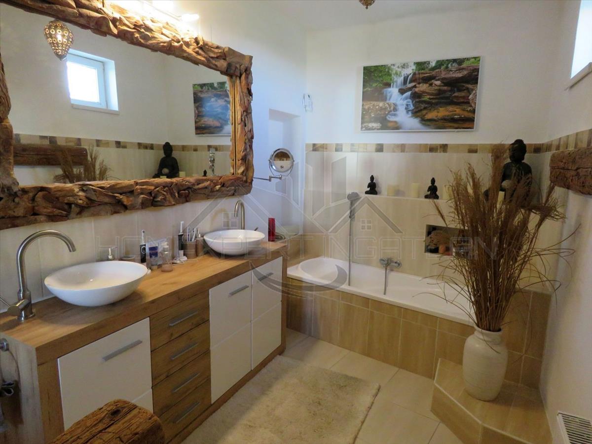 • elegáns fürdőszoba káddal, épített zuhanyfülkével, dupla mosdóval és gyönyörű fadíszítésekkel