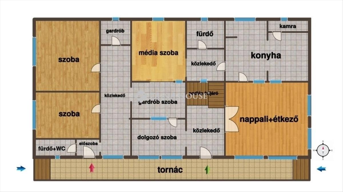 A szobákban hajópadló, a többi részen járólap. a tető javítása kb. 7 Éve zajlott. a lécek fel lettek újítva, a cserepeket kicserélték. a koszorú betonból készült. a födém fa, hungarocellel szigetelve, ledeszkázva, így járható, tárolásra alkalmas. Fa erkély húzódik a tetőtérben az utcafronton.
