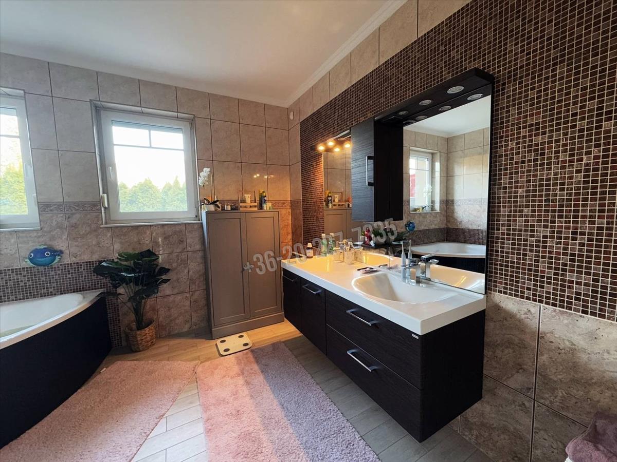 Ahogyan az ingatlan külső megjelenésére, úgy a belső kialakításra is igaz az átgondolt elrendezés, és a jó helykihasználás. a ház teljes belső kialakítása tükrözi a kinti motívumokat. Az épület tervezésénél odafigyeltek a tájolásra is, így a terek, világosak és szinte a nap összes órájában kapják a napfényt. a konyhabútor letisztult és jól felszerelt, ezen felül találunk egy kamrát is, így növelve a tárolási részt. a fürdőszobában beépített fürdőkád, dupla mosdó kapott helyett és w. C. , a mosókonyha külön helyiségben került elhelyezésre. Ezen kívül két másik w. C található. a burkolatok terén is az igényességet fedezhetjük fel, mindenhol gránit, ill. Márvány burkolatot találhatunk. a fürdőszobában minőségi csaptelepek lettek felszerelve. a három hálószobában parketta került elhelyezésre, az egyik szobához gardróbszoba tartozik és közvetlen terasz kapcsolatos. Az ingatlanon belül kialakításra került egy 50 nm-es garázs is, melyben külön helyiségben található a ház gépezete.