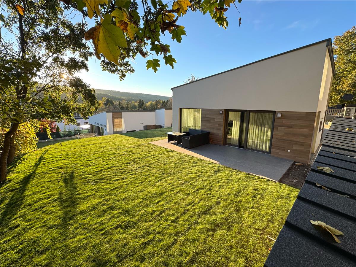 A telek 736 négyzetméter, nagyon szépen gondozott, kiépített, gyönyörűen panorámás. Az a szobák hatalmas ablakain át, ágyából nézheti a hegyeket, a hegy mögül érkező záport nyáron, vagy a hófelhőket télen.