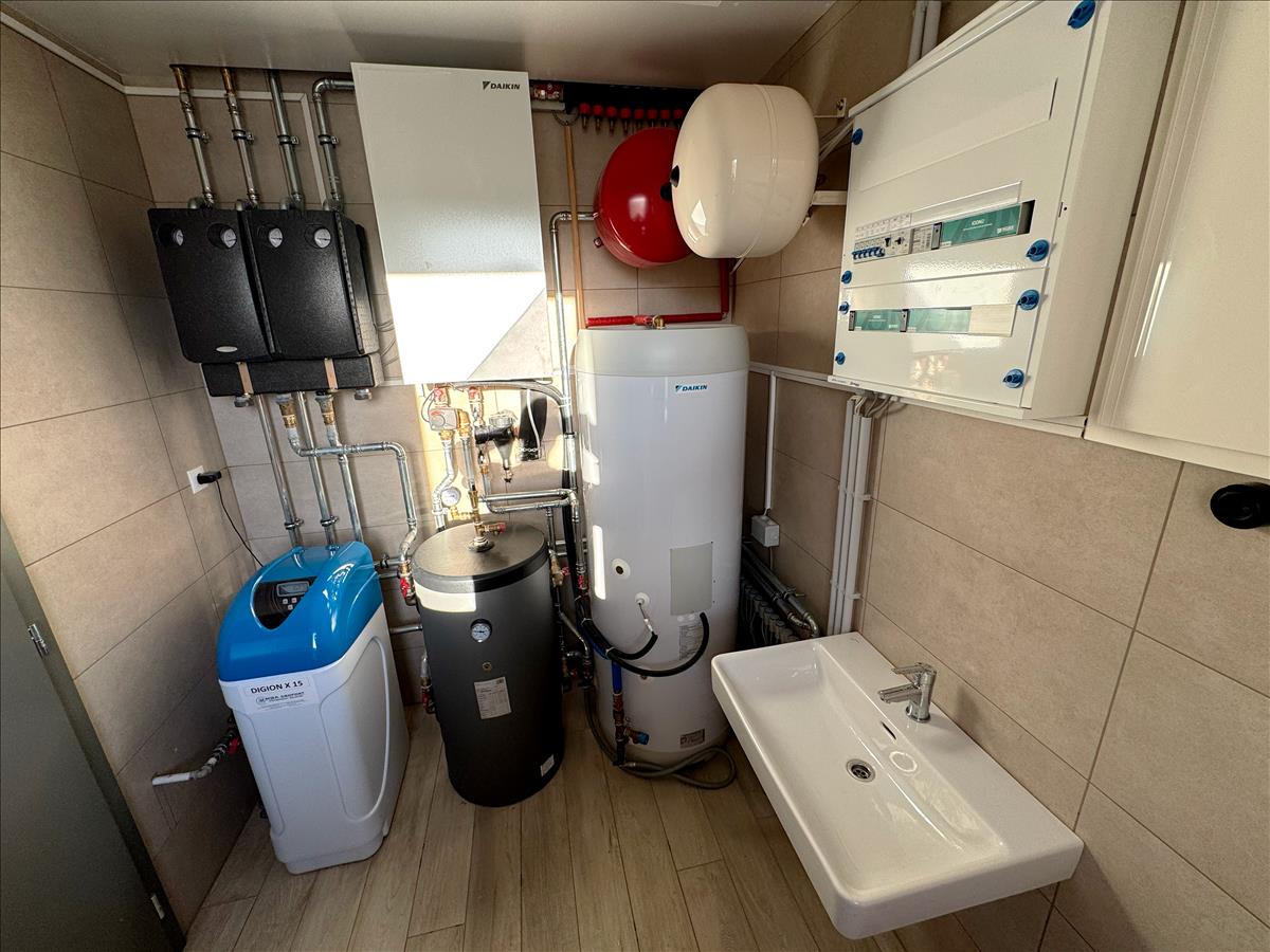 Az új otthona melegét, padlófűtés biztosítja, míg a hűtést mennyezeti rendszer végzi, mindkettő a Daikin Altherma hőszivattyúval működik, amelyhez egy 300 literes melegvíztároló is tartozik. a tető déli tájolású, ideális napelemek telepítésére. Jelenleg nincs napelem a házon, de a kiépítese a csatlakoztatáshoz megtörtént. a ház minden helységében külön szabályozható a hőméréséklet, ezt az ngbs épület automatikai rendszer teszi lehetővé, kiépített termosztátokkal. Az ablakok hatalmasak háromrétegű üvegezéssel Hoffstadter nyílászárók, rajtuk aluminiumból készült motoros redőnyök biztosítják a plusz csend, és hőszigetelést. a házon 15 centiméteres szigetelés van. További extra kényelmi funkciók közé tartozik a riasztó, az automata öntözőrendszer, - a kerti szerszámok elhelyezéséhez tartozik egy 14 négyzetméteres, szépen kialakított, épített, kerti tároló is - a vízlágyító, és a beépített gardróbszekrényekkel felszerelt tárolóhelyiség, pliszés szúnyoghálók.