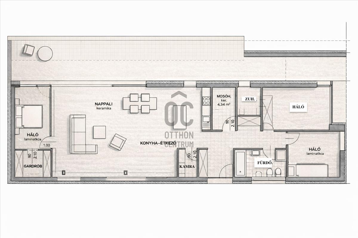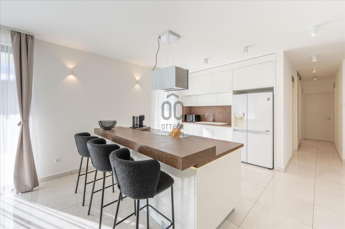A 4 szobás ingatlan netto alapterülete 130 m², bruttó 163 m², amelyhez egy impozáns, 67 m²-es, részben fedett terasz kapcsolódik – ideális pihenéshez, családi és baráti összejövetelekhez.