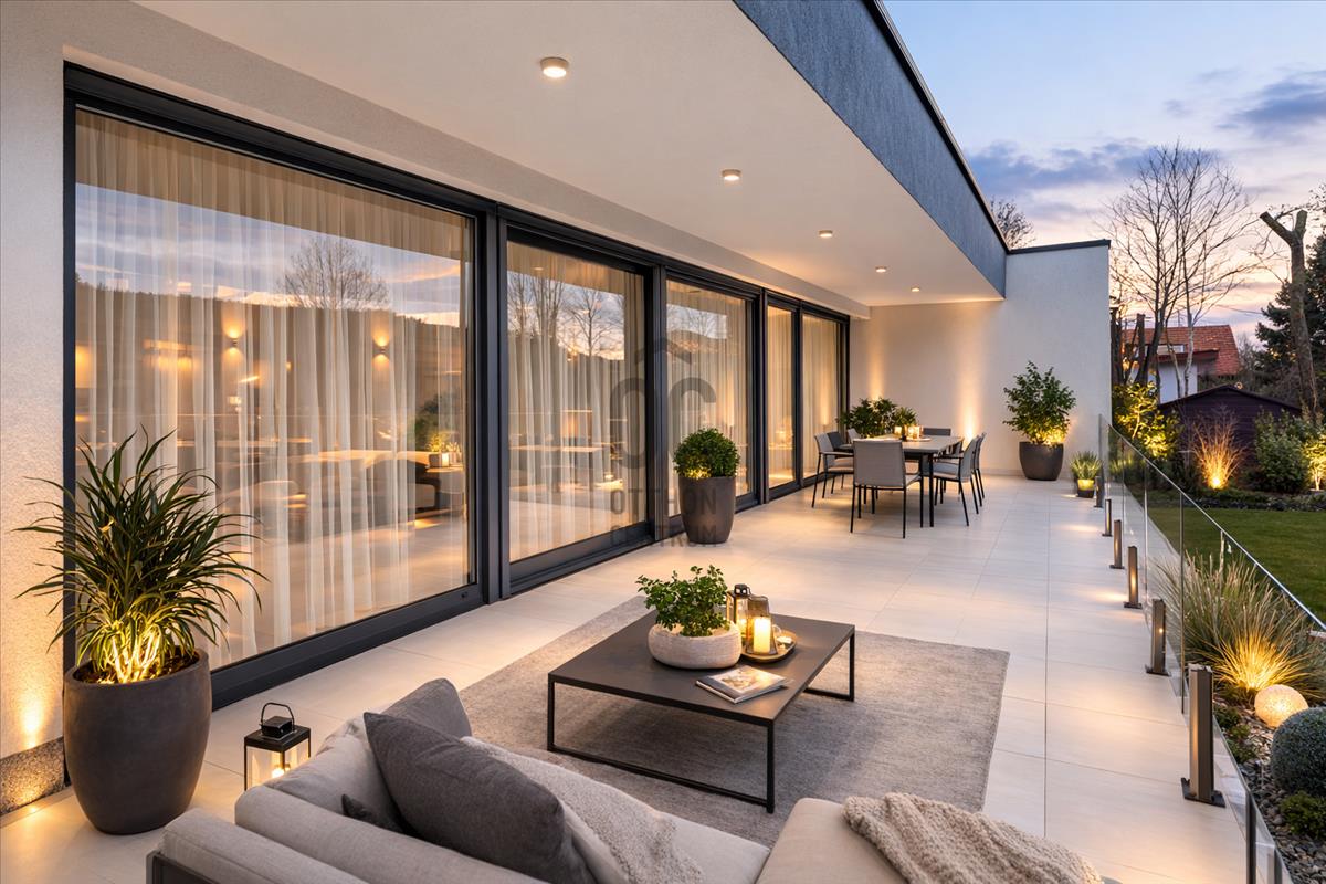 A nappaliból és minden helyiségből közvetlen kijárat nyílik a teraszra, a hatalmas üvegfelületek pedig egész nap természetes fénnyel töltik meg az otthont.