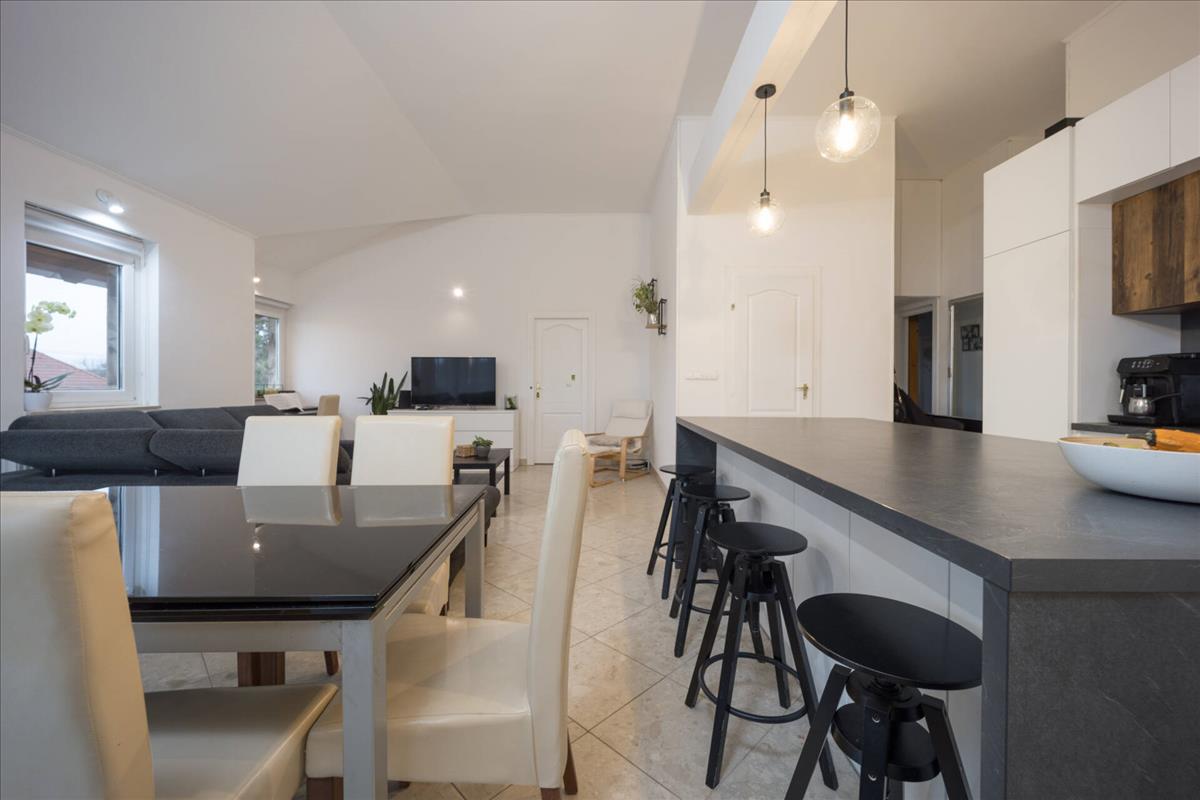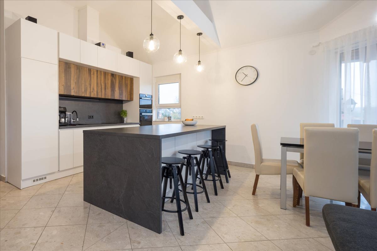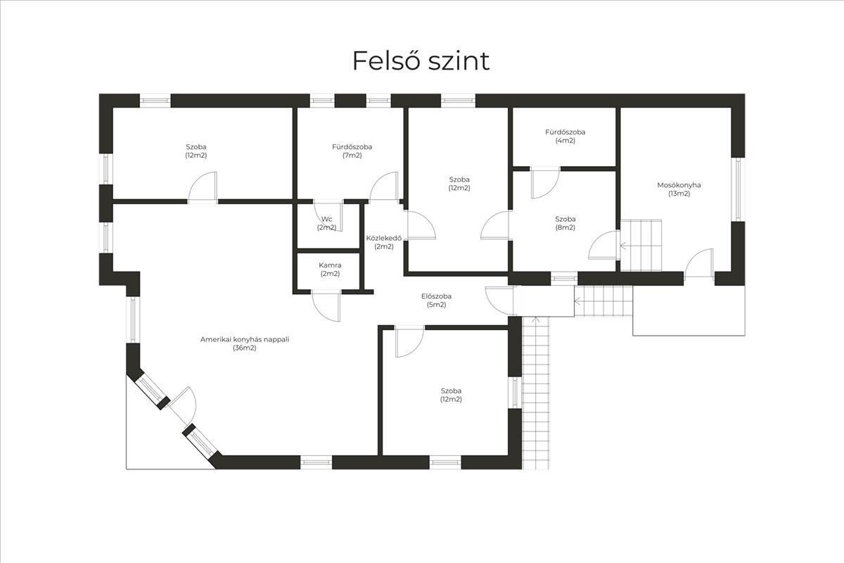 A felső szint 115 m² alapterületű, 2007-ben épült Ytong falazattal és 6 cm-es hőszigeteléssel. Az emeleti lakás frissen felújított, modern, tágas terek jellemzik, az amerikai konyhás nappaliban klíma gondoskodik a komfortos hőérzetről. a fűtés vegyestüzelésű kazánnal megoldott, padlófűtéssel és radiátorokkal kombinálva, a melegvíz villanybojlerrel biztosított. Az elrendezés praktikus: amerikai konyhás nappali, négy szoba (közülük kettő galériás), két fürdőszoba, mosókonyha, mellékhelyiség, spájz, előszoba, közlekedő és egy tágas terasz alkotja.