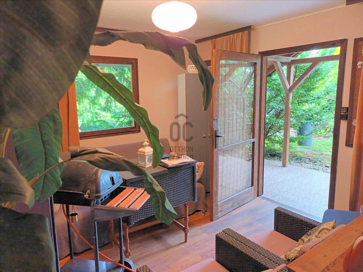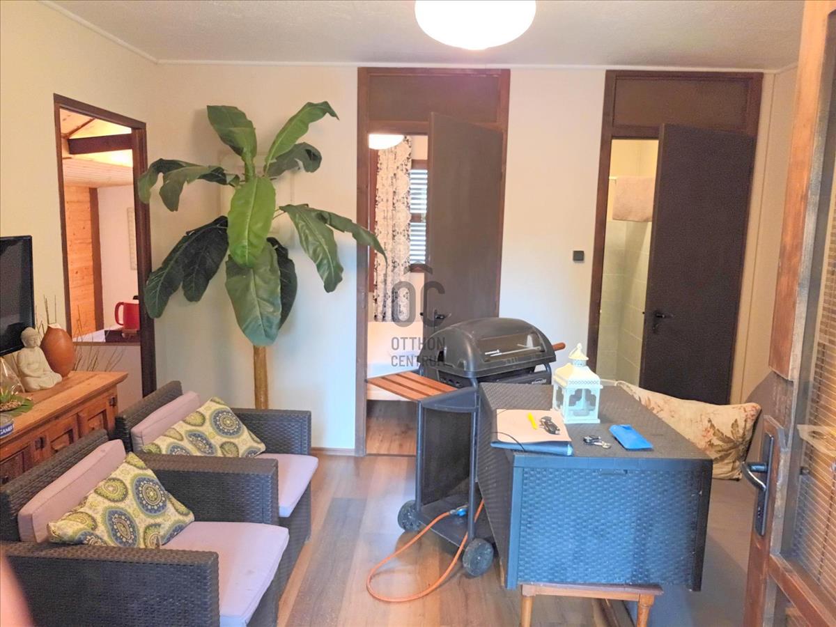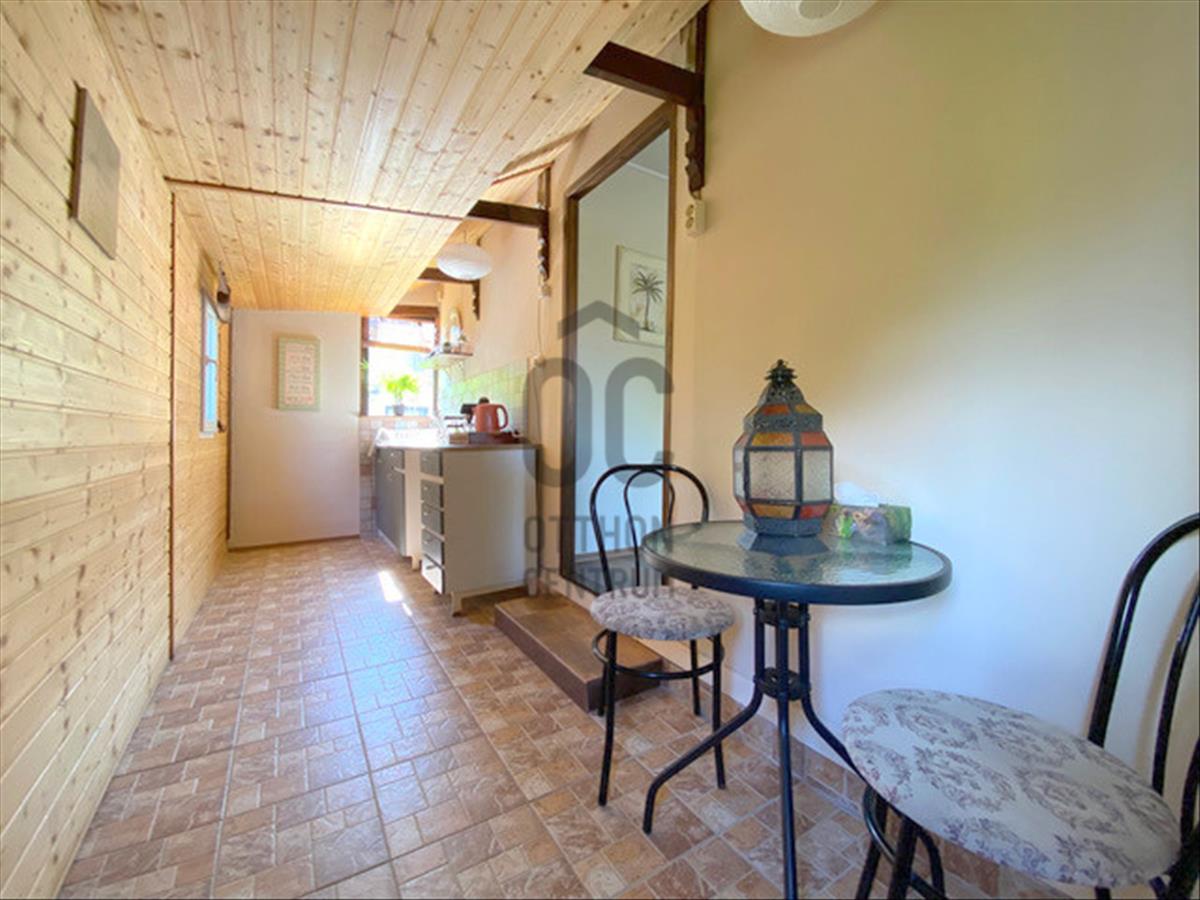 A kisházban 1 különnyíló szoba, nappali, fürdőszoba-Wc, konyha-étekező helyiségek vannak, illetve itt is találunk egy 15, 76 négyzetméteres teraszt. a szoba és a nappali laminált burkolatot kapott, a többi helyiségben járólap van.