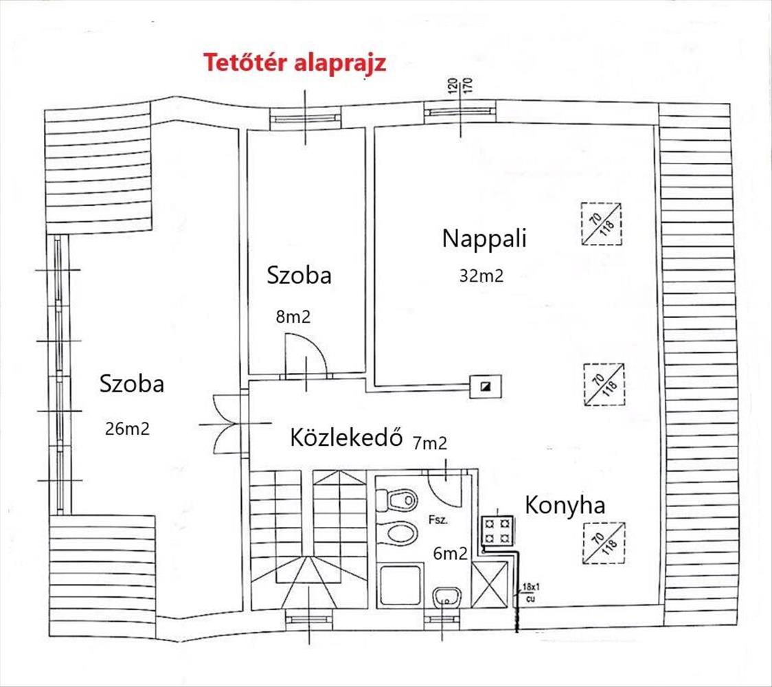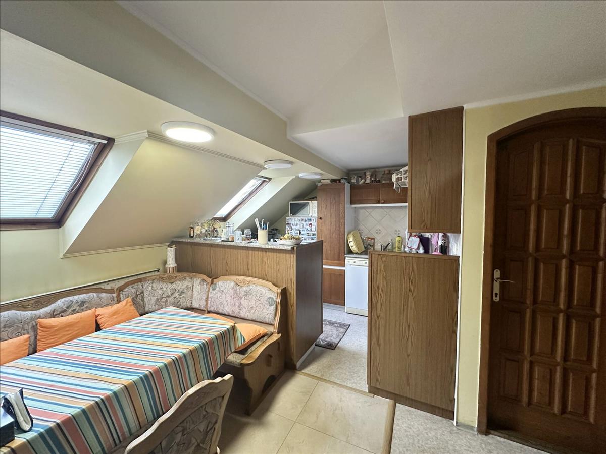 A tetőtérben amerikai konyhás nappali, két hálószoba, fürdő, wc és közlekedő található.