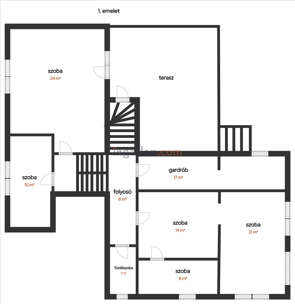 Szobák: nappali + 8 szoba (ebből két különálló gardróbszoba és 2 félszoba)