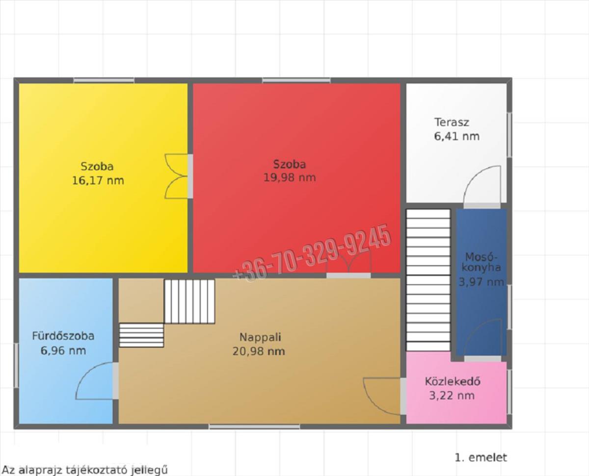 Emelet: nappali, 2 szoba, fürdőszoba, mosókonyha, terasz