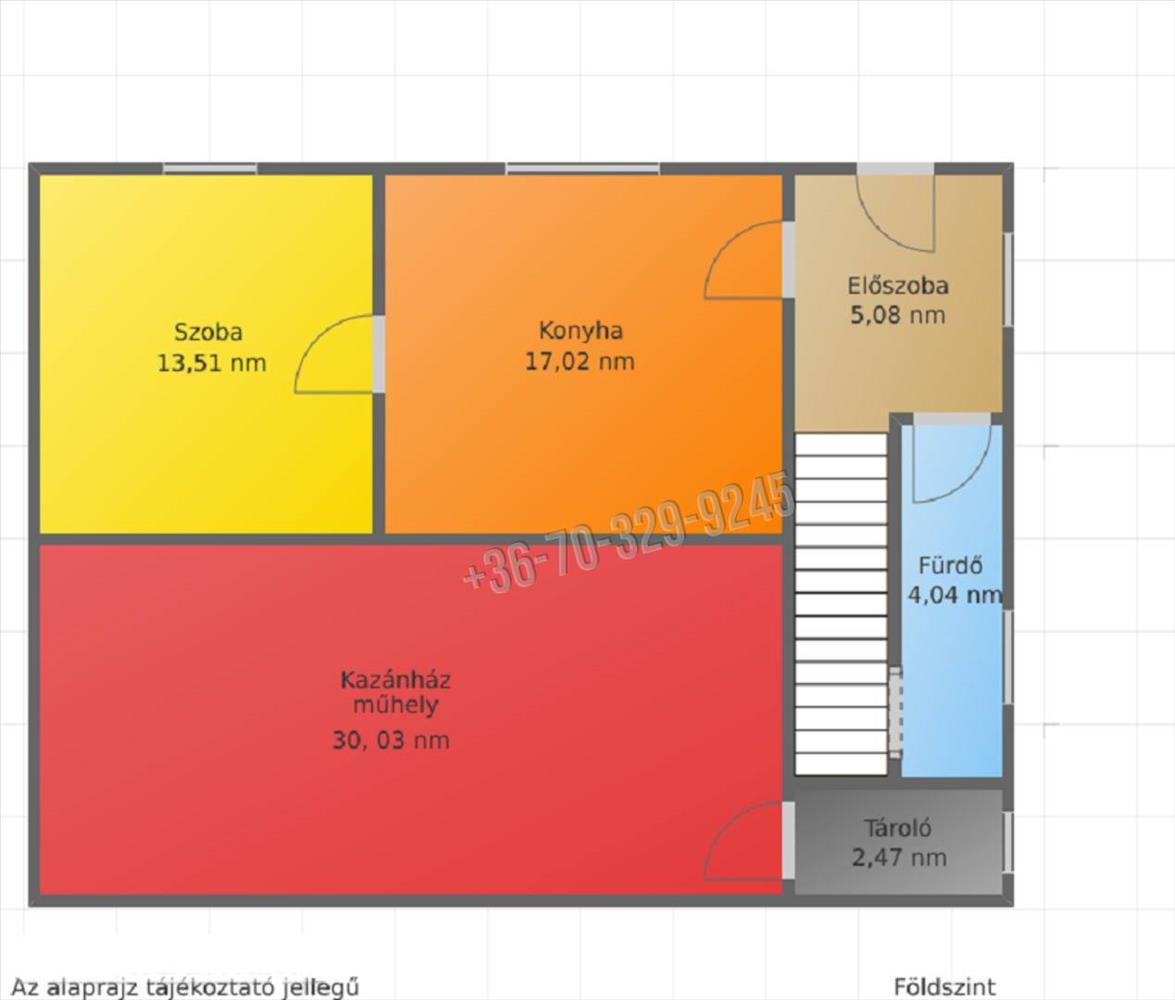 Földszint: konyha, fürdőszoba, 1 szoba, előszoba, kazánház/műhely