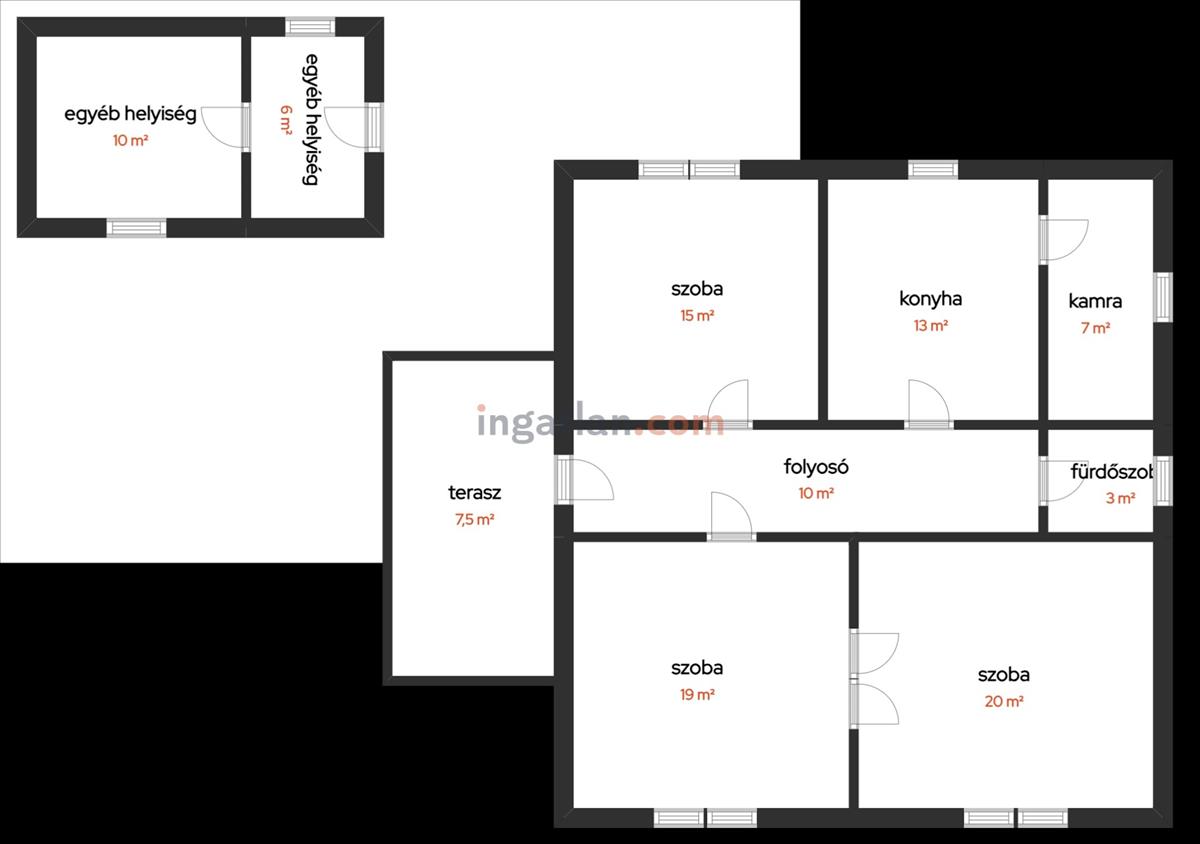 - Hasznos alapterület: 87 m2 + 7, 5 m2 fedett terasz, 16m2-es melléképület és egy 20 m2-es garázs