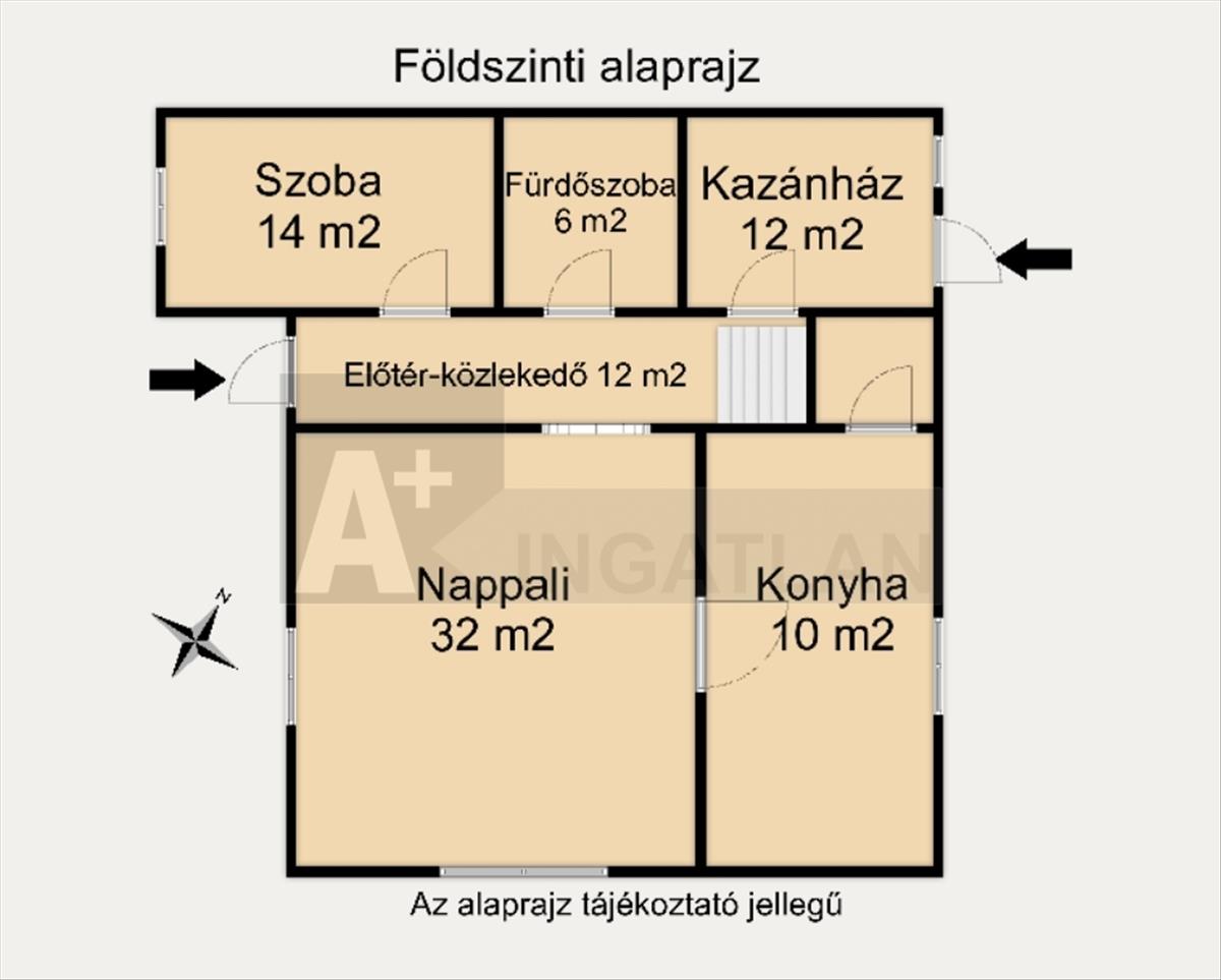 Földszint: konyha, nappali + 1 szoba, kádas fürdőszoba wc-vel, kazánház