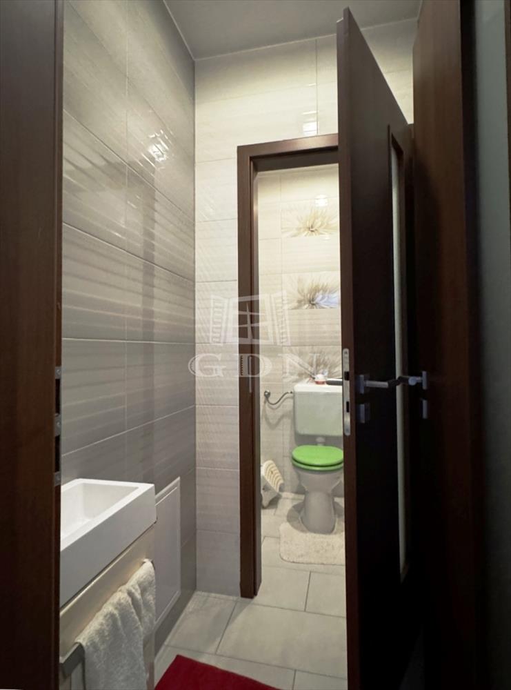 Az alsó szinten tágas közlekedő/előszoba, wc, fürdőszoba beépített zuhanyzóval, amerikai konyha-nappali teraszkapcsolattal került kialakításra.