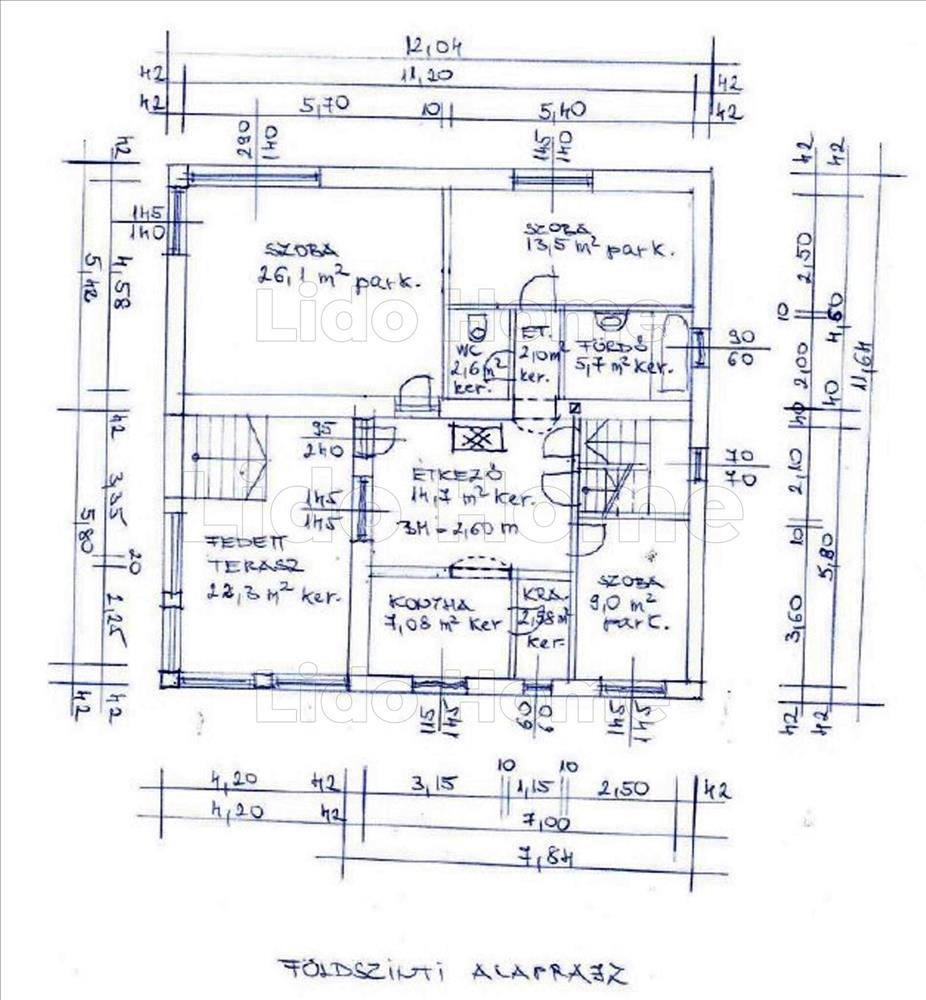 - földszint (87 nm + fedett terasz 22, 3 nm): előtér, konyha - étkező, kamra, fürdőszoba zuhanyzóval+ wc, 3 szoba, fedett terasz, kültéri lépcső az emeletre