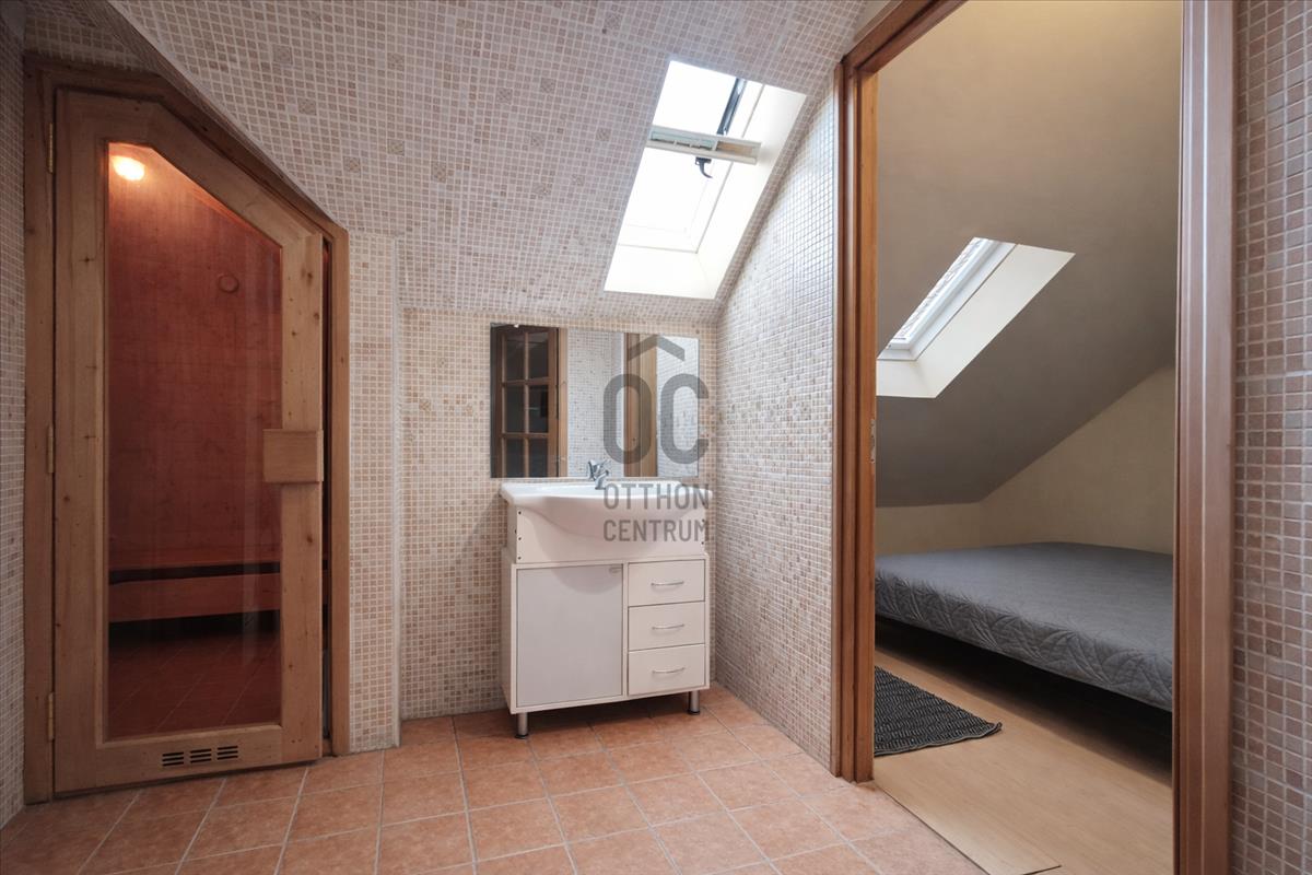Az emeleten további tágas nappali (jelenleg klubszoba és konditerem), egy hálószoba, fürdőszoba és szauna kapott helyet, így a ház tökéletes a teljes kikapcsolódáshoz, akár két generáció számára is.