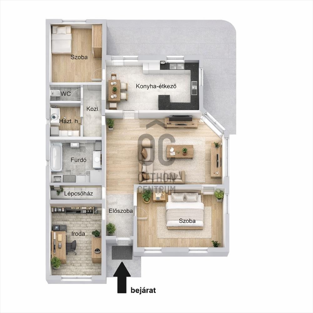 A földszinten tágas, egybenyitott nappali–étkező–konyha fogadja, mellette két hálószoba, külön fürdőszoba és wc. a fedett előtérből nyíló, jelenleg irodaként használt helyiség könnyedén átalakítható garázzsá vagy további szobává, de vállalkozási célokra is ideális.